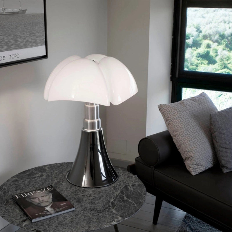 La lampe Pipistrello Medio est une version plus petite de la célèbre Pipistrelloclassique du design dessinée en 1966 par Gae Aulenti. Reine du design italien depuis plus de 50ans, la lampe Pipistrello Martinelli Luce est composée d’une base tulipe en métal, d’un bras en acier inoxydable brossé télescopique et d’un diffuseur en méthacrylate blanc opalin. La Pipistrello Medio Martinelli Luce est une lampe de table avec une lumière diffuse. Plus petite que la version classique, sa hauteur est réglable entre 50 et 62 cm de hauteur, grâce à un système télescopique. Cette version est équipée d'une source LED intégrée et d'un variateur d'intensité lumineuse. Le dessin de son diffuseur s’inspire des ailes de la « pipistrello », chauve-souris d’Europe d’où elle tient son nom. En effet, la forme de la base évasée se développe en hauteur en s’élargissant au niveau des nervures du diffuseur comme les ailes d’une chauve-souris. La lumière diffuse que la Pipistrello Medio Martinelli Luce renvoie et l’ingéniosité de son bras télescopique ont participés à construire le succès qu’elle connaît aujourd’hui.