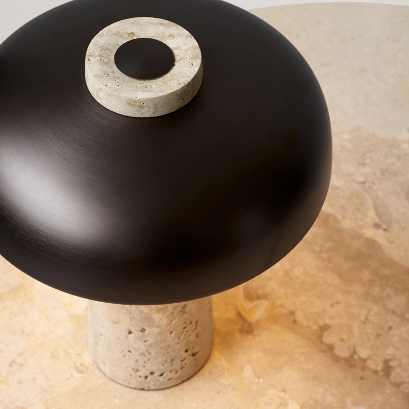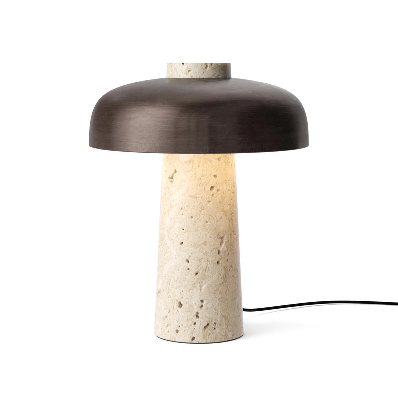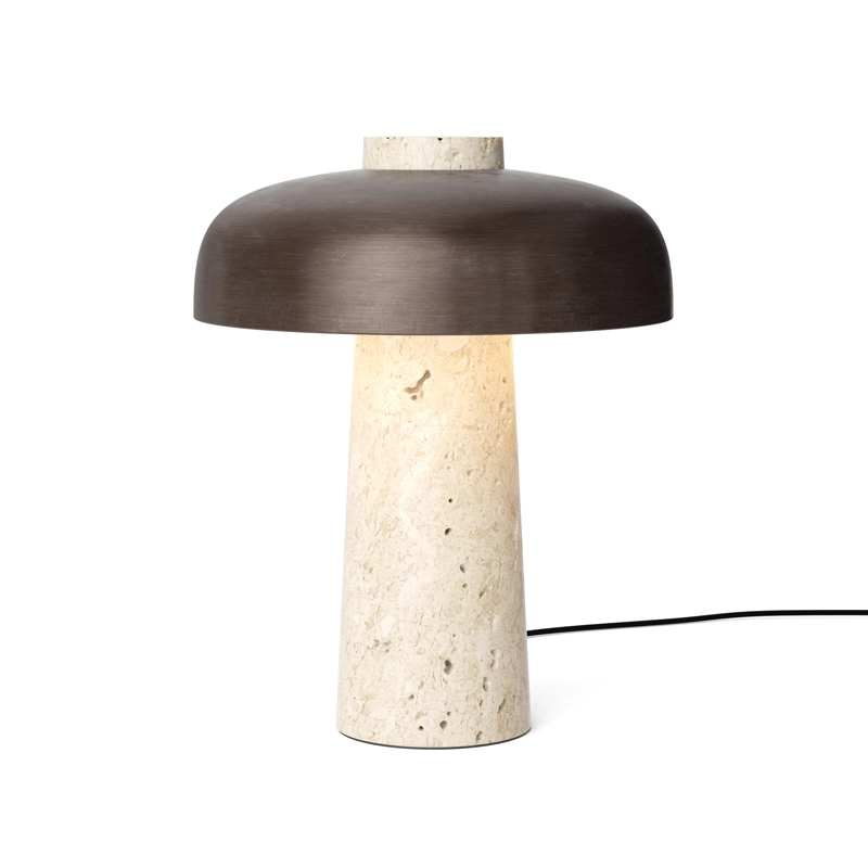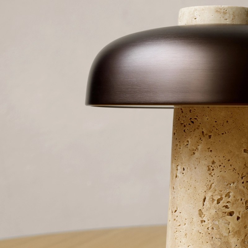 Inspiré par le jeu de structure créé par les contraintes géométriques, le socle conique en travertin et l'abat-jour en laiton bruni de