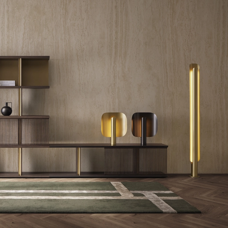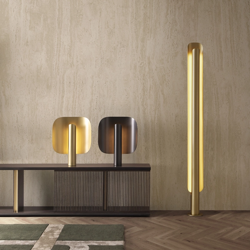 La structure de Stockholm se compose d’une source lumineuse verticale dissimulée dans un cylindre métallique, et d’un abat-jour incurvé. Cette disposition permet au luminaire d’émette un flux chaleureux, discret et tamisé, amplifié par les finitions sophistiquées du métal.