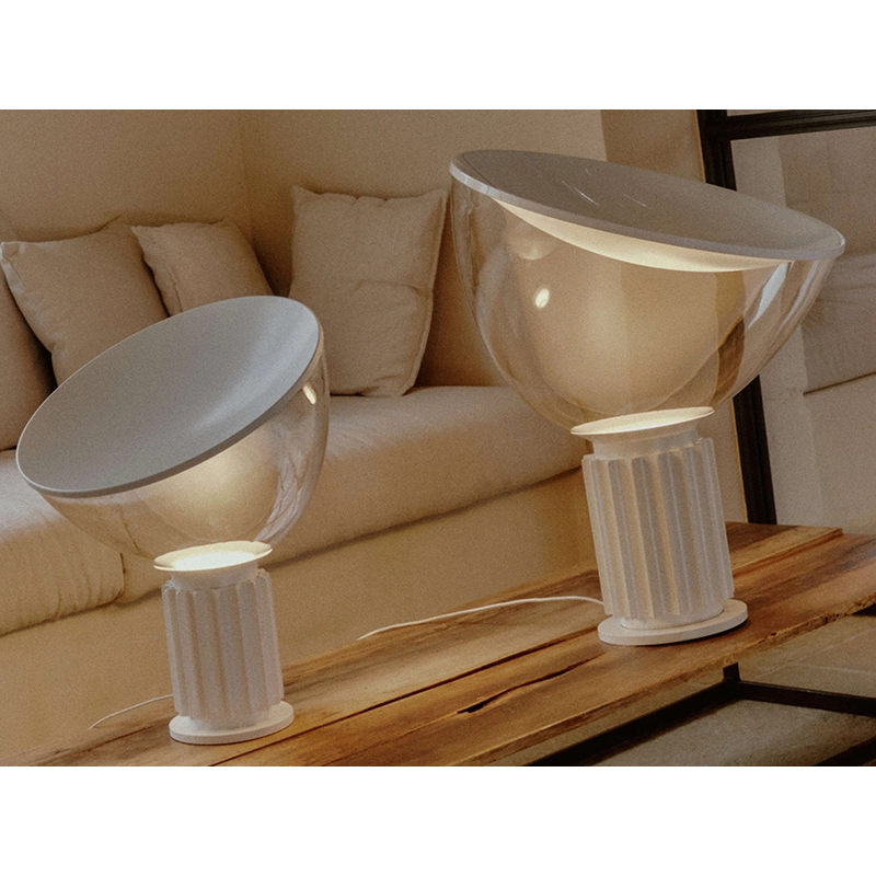 La lampe Taccia est une icône du design, conçue par les frères Castiglioni pour Flos et produite pour la première fois en 1962. Cette lampe de table à lumière indirecte et réfléchie est constituée d'un réflecteur en métal verni posé sur un diffuseur orientable, lui-même en verre transparent soufflé à la bouche. La taille du diffuseur est volontairement disproportionnée par rapport au socle en aluminium noir, inspiré des colonnes antiques, sur lequel il est juste posé. En fonction de l'orientation du diffuseur, la lampe Taccia émet un éclairage large, ou plus concentré.