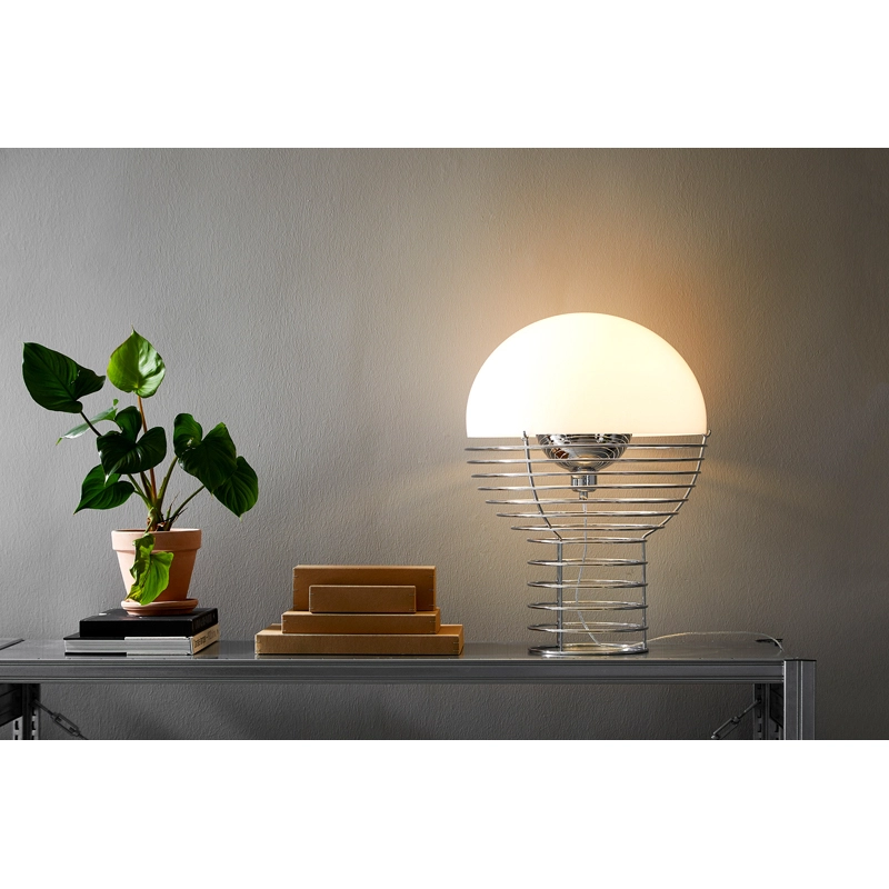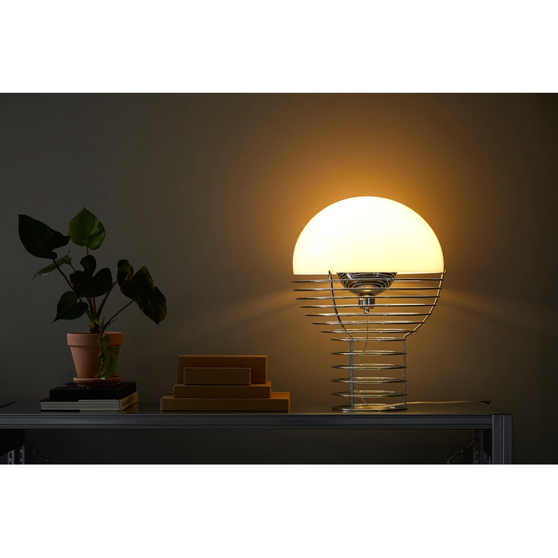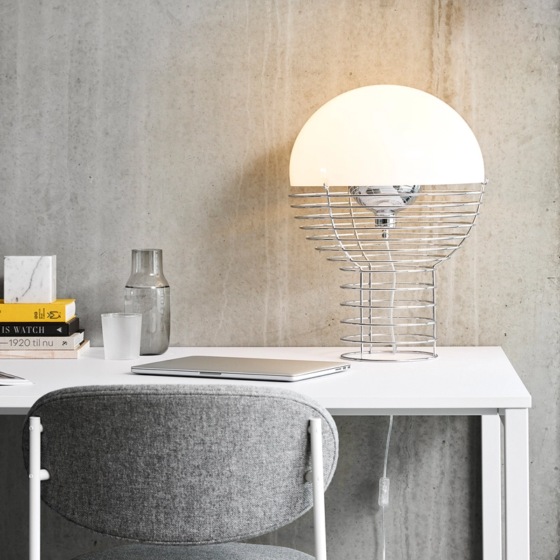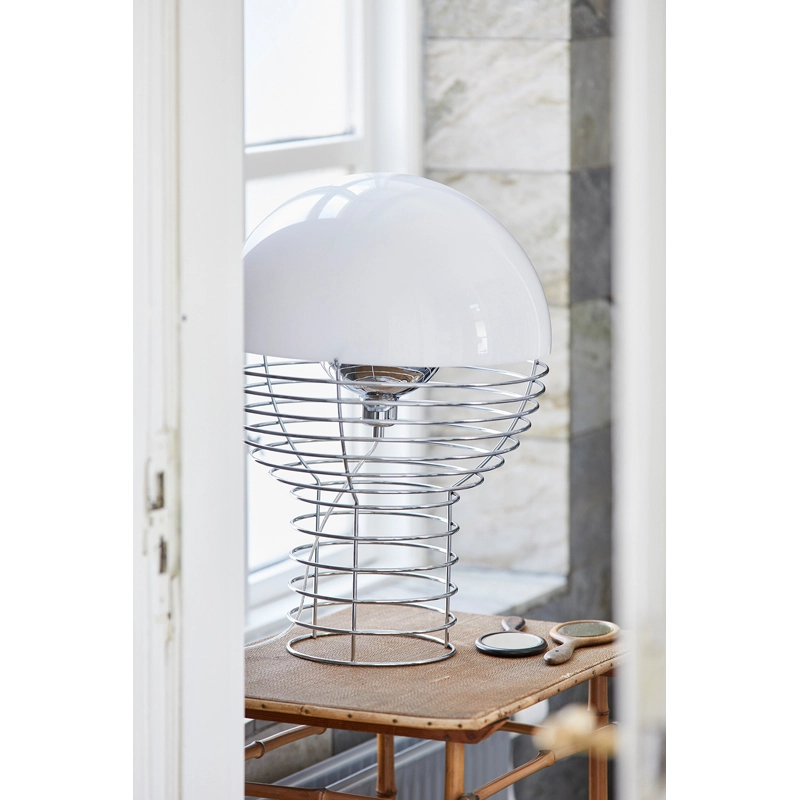 Dessinée par Verner Panton en 1972, la lampe à poser Wire se distingue par sa structure en tige d’acier chromé qui s’élargit vers le haut pour supporter un ... En savoir plus
