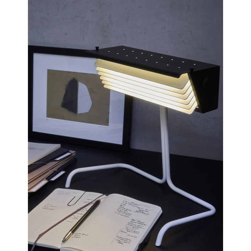 Créée en 1957 et rééditée par la suite par DCW éditions, Biny Table est toujours d’une grande modernité. Pour une bonne lecture, Biny a été conçue avec des ailettes qui dirigent la lumière intense sur l’intégralité du plan utile. Pour un éclairage doux et étonnamment efficace, cette réédition développée utilise la technologie LED intégrée en 2700 K avec des ailettes orientables grâce à une mollette.