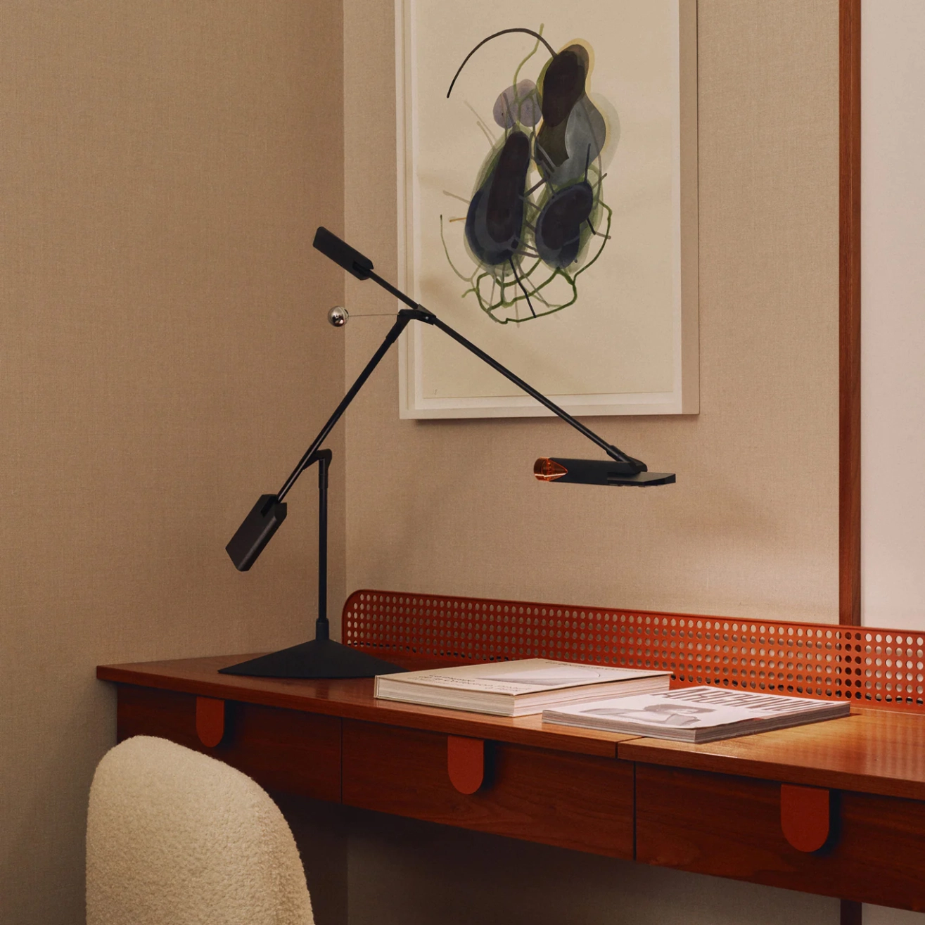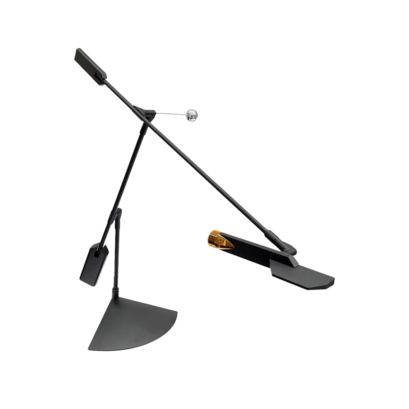 Halley est une structure orbitale qui permet littéralement tous les mouvements possibles, en restant immobile dans sa position, en déplaçant la tête de la lampe et en n’utilisant qu’une seule main. Avec pas moins de 6 articulations et 360 degrés de rotation pour chacune d’entre elles, la lampe peut se déplacer librement dans un espace tridimensionnel. La boule sert de balancier pour l’ensemble du poids de l’appareil, ce qui assure sa stabilité.