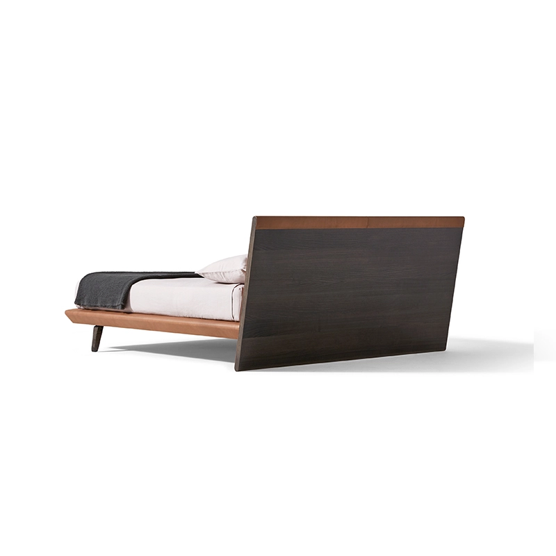 lit en frêne teinté moka, tête de lit affleurante, cadre de lit recouvert en cuir, piètement en bois massif