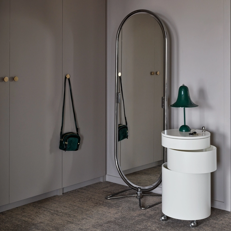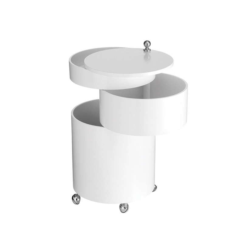Barboy de Verner Panton est à la fois une table d'appoint et un meuble de rangement mobile. Il est composé de quatre parties cylindriques qui pivotent entièrement vers l'extérieur, permettant de visualiser et d'utiliser toute la surface des plateaux de rangement. Edité par Verpan, le rangement Barboy représente parfaitement le travail de Verner Panton. Il combine une surface matte avec une poignée et des roulettes chromées, qui créent un contraste élégant.