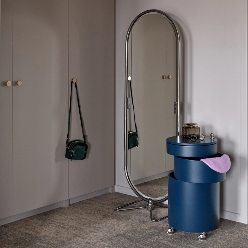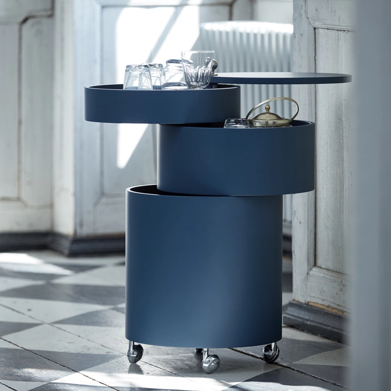 Barboy de Verner Panton est à la fois une table d'appoint et un meuble de rangement mobile. Il est composé de quatre parties cylindriques qui pivotent entièrement vers l'extérieur, permettant de visualiser et d'utiliser toute la surface des plateaux de rangement. Edité par Verpan, le rangement Barboy représente parfaitement le travail de Verner Panton. Il combine une surface matte avec une poignée et des roulettes chromées, qui créent un contraste élégant.