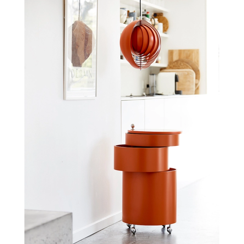 Barboy de Verner Panton est à la fois une table d'appoint et un meuble de rangement mobile. Il est composé de quatre parties cylindriques qui pivotent entièrement vers l'extérieur, permettant de visualiser et d'utiliser toute la surface des plateaux de rangement. Edité par Verpan, le rangement Barboy représente parfaitement le travail de Verner Panton. Il combine une surface matte avec une poignée et des roulettes chromées, qui créent un contraste élégant.