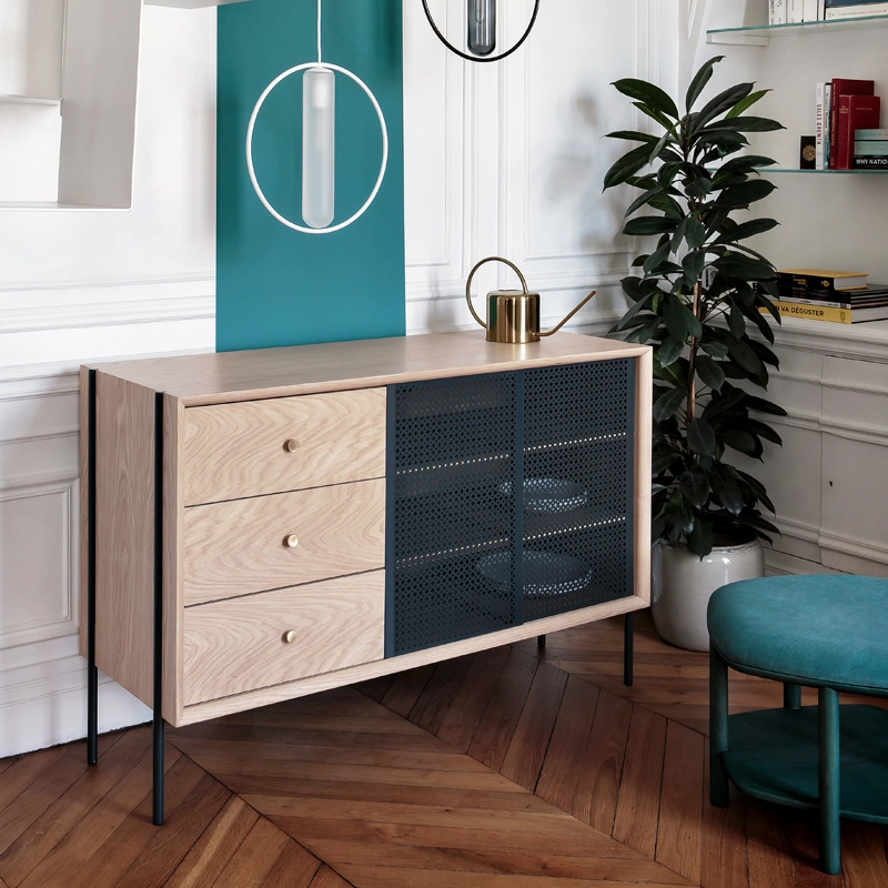 Après une première déclinaison de buffets aux lignes contemporaines et une vitrine aux allures sixties, Harto lance son premier buffet haut. La collection de rangements Gabin se démarque par ses lignes modernes, ainsi que par le motif de ses portes coulissantes, inspiré du cannage. Le buffet Gabin allie magnifiquement les matériaux, associant le chêne avec le métal laqué et les poignées en laiton brossé. Il est doté de trois tiroirs et de deux portes coulissantes ajourées. Le bloc tiroir peut être dévissé pour être installé à gauche ou à droite. Avec ses formes simples, ce meuble de rangement trouvera sa place dans tous les salons contemporains.