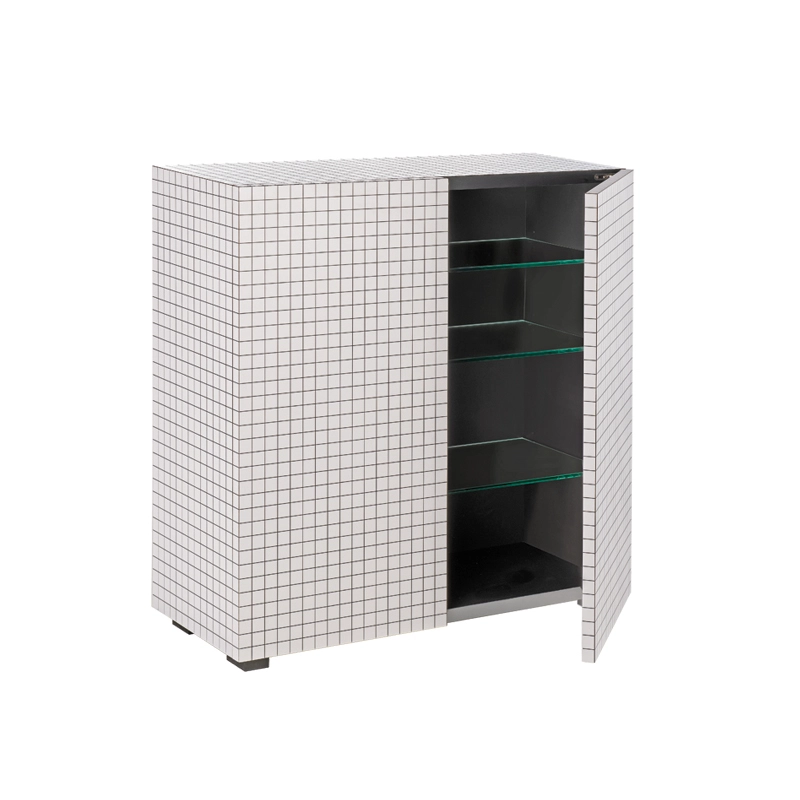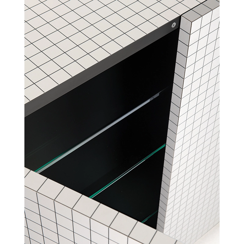 panneau alvéolaire plaqué en print, couleur blanche, imprimé en digital à carrés noirs, intérieur stratifié noir, tablettes réglables verre trempé 10 mm