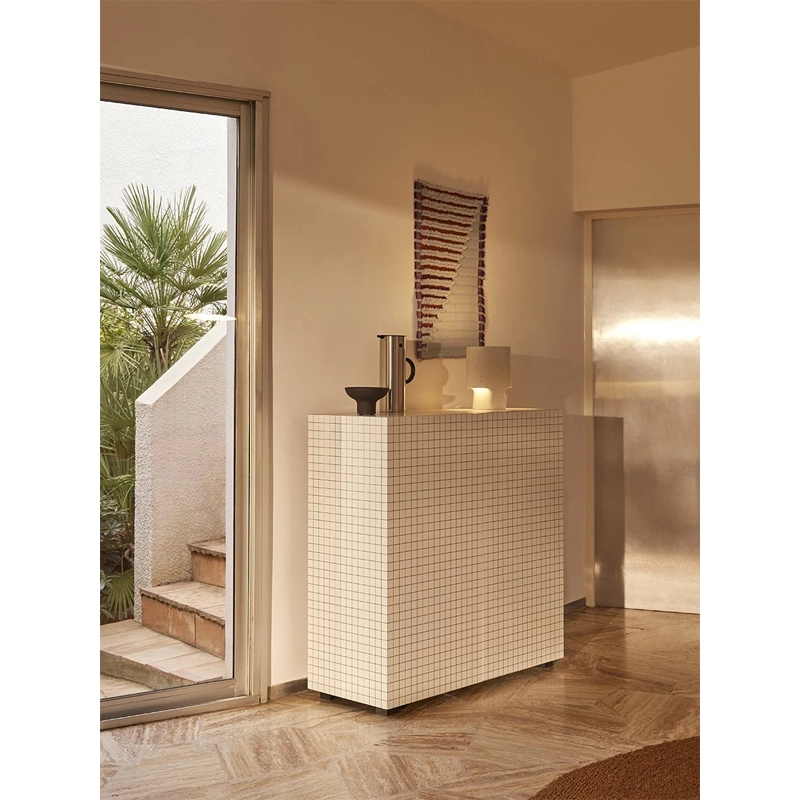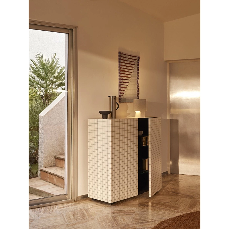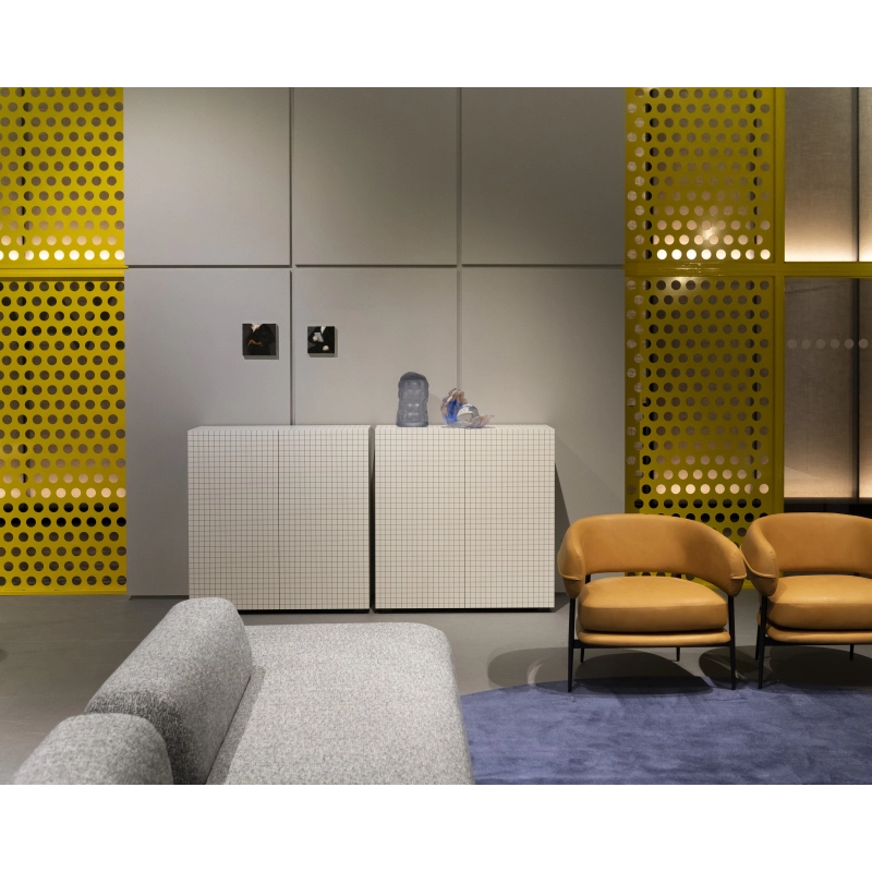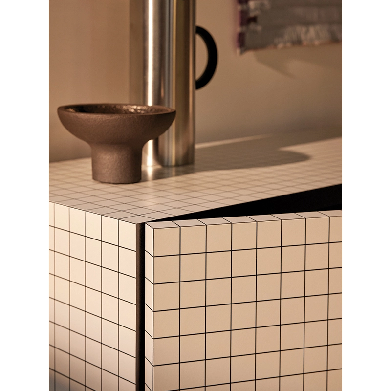 Les produits de la collection Quaderna sont le résultat d’un processus hautement industrialisé et en même temps d’un grand savoir-faire artisanal. Le stratifié à carreau a été créé spécialement sur la base du design de Superstudio et présente un quadrillage avec un entraxe de 3 cm, réalisé par impression numérique. Ce stratifié est ensuite appliqué manuellement, nécessitant une grande précision et plusieurs heures de travail pour chaque pièce. La convergence des lignes du motif détermine l’homogénéité des surfaces et confère au meuble une forte personnalité.