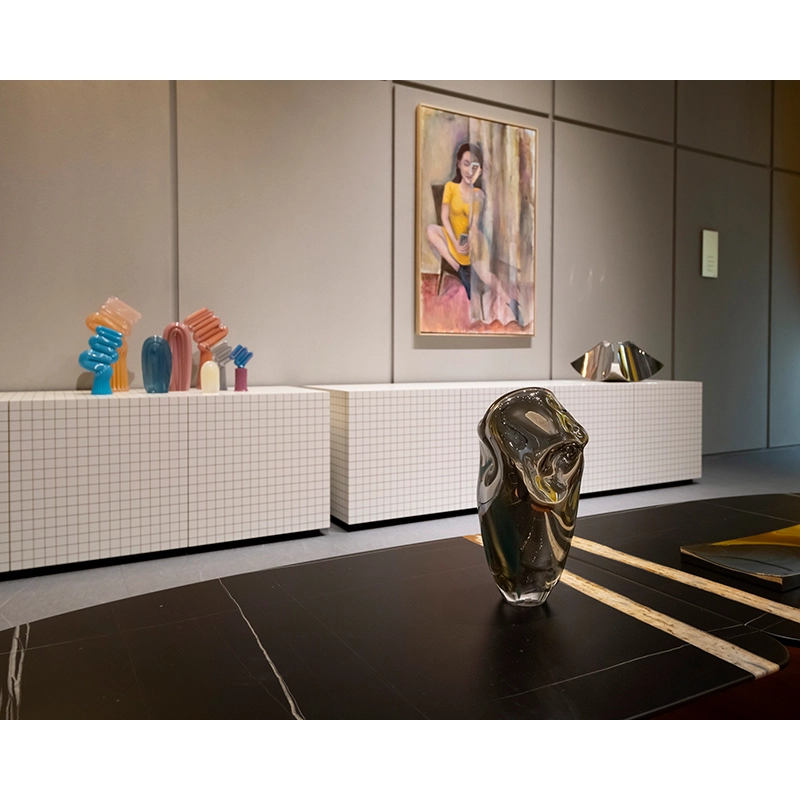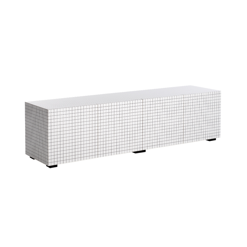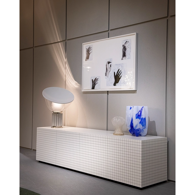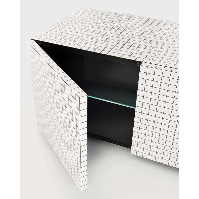 Les produits de la collection Quaderna sont le résultat d’un processus hautement industrialisé et en même temps d’un grand savoir-faire artisanal. Le stratifié à carreau a été créé spécialement sur la base du design de Superstudio et présente un quadrillage avec un entraxe de 3 cm, réalisé par impression numérique. Ce stratifié est ensuite appliqué manuellement, nécessitant une grande précision et plusieurs heures de travail pour chaque pièce. La convergence des lignes du motif détermine l’homogénéité des surfaces et confère au meuble une forte personnalité.