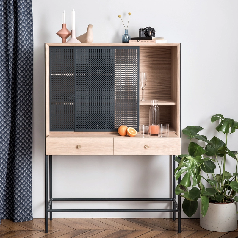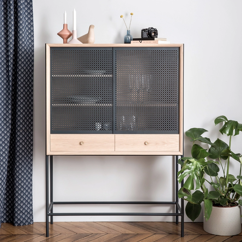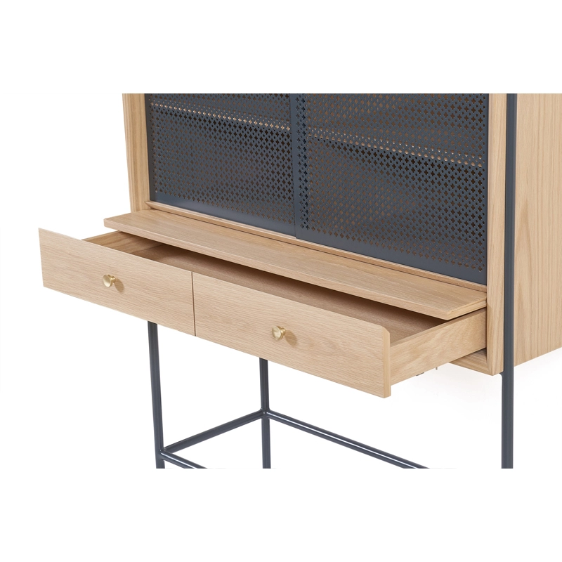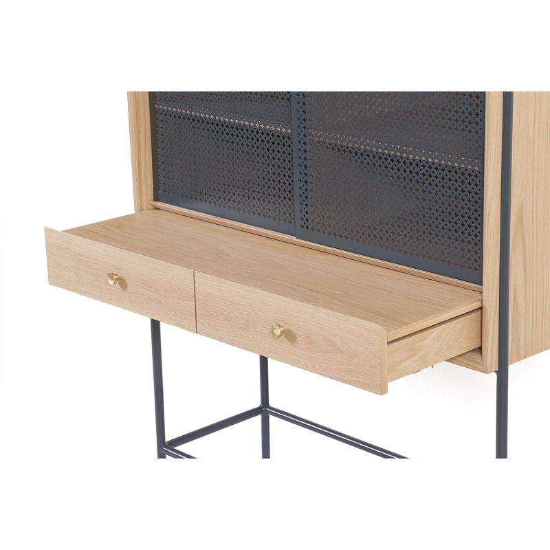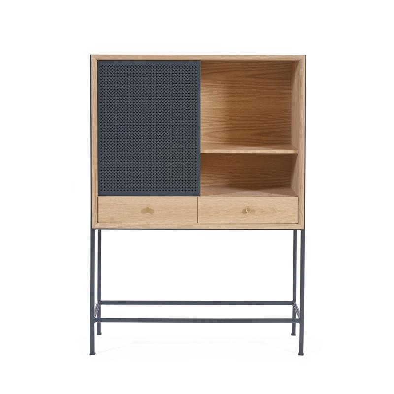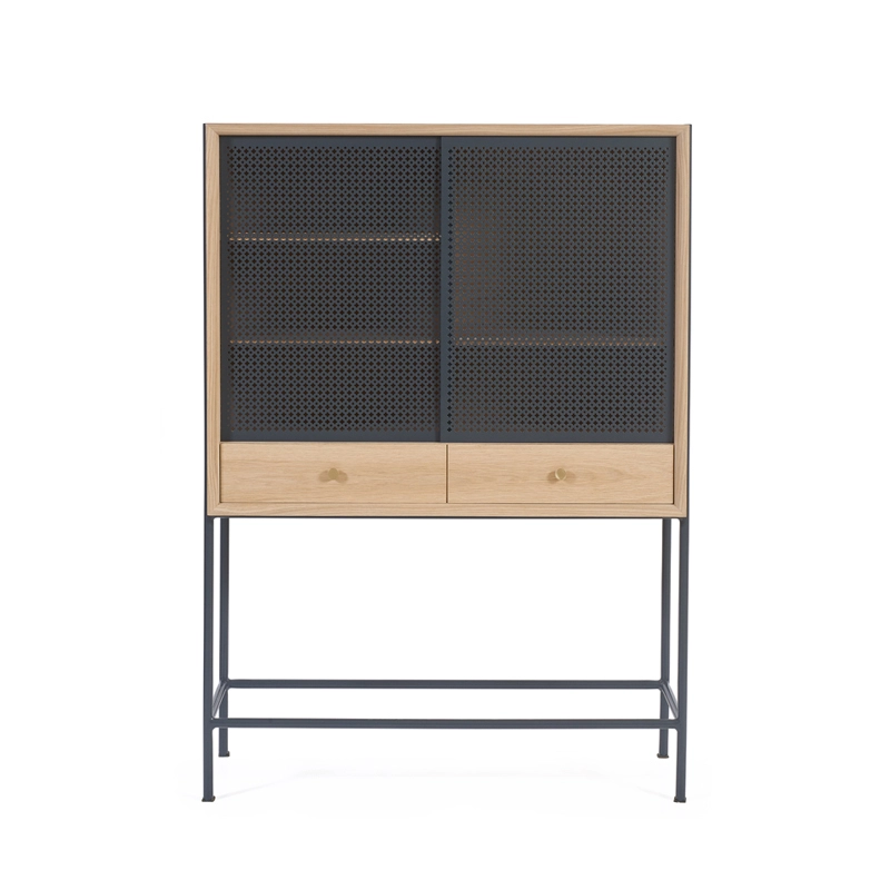 Dessinée par Mathieu Galard, directeur artistique d’Hartô, Gabin est une collection de rangements qui allie simplicité des formes et beauté des matériaux. Ce cabinet, inspiré des vitrines rétro, se démarque principalement par le motif inspiré du cannage, ainsi que par l’association bois et métal. Il est doté de deux portes coulissantes ajourées, qui laissent entrevoir l'intérieur du meuble, et de deux tiroirs. A l'intérieur des tiroirs, un plateau coulissant peut être sorti pour créer une tablette.