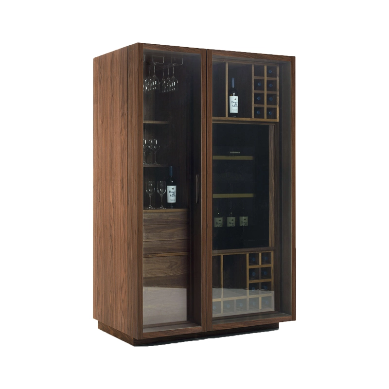 Edité par la maison italienne Riva 1920, Cambusa Wine Glass est un meuble de rangement multifonction, alliant élégance et praticité. Fabriqué en bois massif, il présente des portes en verre avec une ouverture à angle de 180°. L'intérieur de Cambusa Wine Glass est conçu avec des compartiments dédiés aux verres et aux bouteilles. Il est aussi équipé d'un système LED sur toute la hauteur du montant central, offrant un éclairage automatique activé par des capteurs à l'ouverture des portes. Les portes en verre transparent avec cadre en noyer massif, les tiroirs et étagères extractibles avec système push-pull sur glissières métalliques sont autant de détails qui soulignent le raffinement et la fonctionnalité de la Cambusa Wine Glass de Riva 1920.