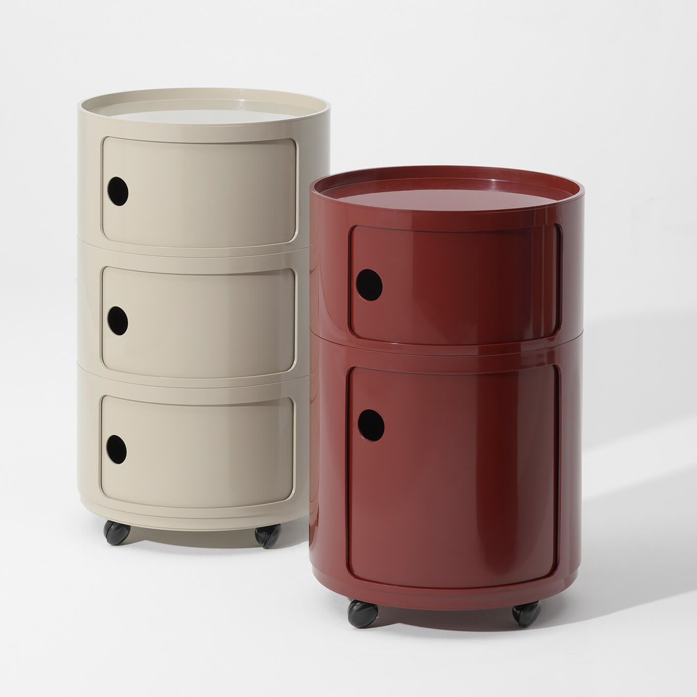 Ces éléments de rangement modulables, appelés Componibili, créés par Anna Castelli Ferrieri en 1968, ont été conçus afin de répondre à diverses exigences d'utilisation et trouver leur place dans toutes les pièces de la maison : la salle de bain, la chambre, la cuisine ou le séjour. Bien pensés, les éléments modulables Componibili répondent à une attente de rangement légitime et s’adaptent à tous usages. L'idée maîtresse est la superposition, élémentaire mais solide, des différents blocs Componibili qui, par simple emboîtement, composent des meubles de rangement pratiques. Ce cylindre en plastique moulé, aux lignes sobres et fonctionnelles, symbolise la rupture qui s’est opérée dans le design au cours des années 1960. Aujourd’hui, la collection s’enrichit avec le Componibili New Big, une version revisitée aux dimensions plus généreuses, disponible avec 2 ou 3 tiroirs. Plus spacieux tout en conservant la même modularité, il offre un volume de rangement accru et s’intègre aisément dans toutes les pièces de la maison. Le Componibili New Big conserve l’esprit démocratique, accessible et audacieux du modèle original, répondant toujours aux besoins d’une société moderne en quête de praticité et de design. Grâce à Kartell, le plastique devient un matériau noble et raffiné, au service d’un mobilier aussi esthétique que fonctionnel. Objet emblématique de Kartell, Componibili a marqué les esprits depuis son entrée au Salon du meuble de Milan. Flexible et intemporel, il a reçu de multiples marques de reconnaissance et est exposé au MoMA de New York et au Centre Pompidou à Paris. Vendues séparément, des roulettes peuvent être ajoutées afin d’offrir une mobilité optimale et de transformer les Componibili en un module encore plus pratique, qui s’adapte facilement à votre usage quotidien.