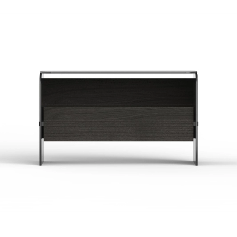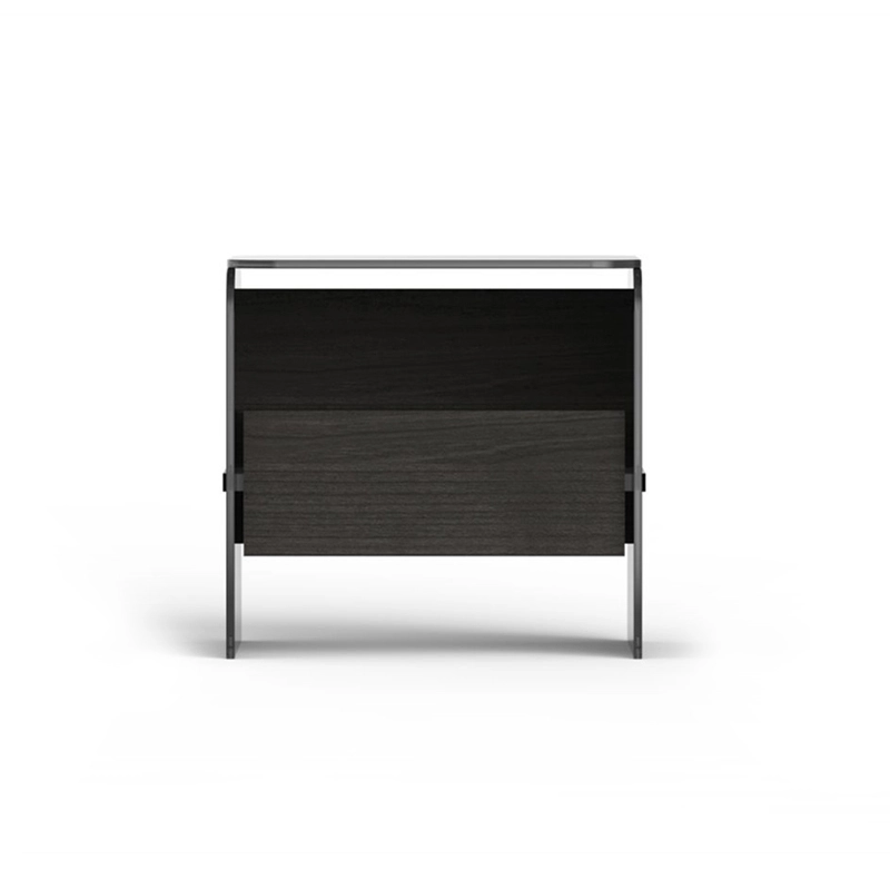 Le chevet Holly Comodino de Pinuccio Borgonovo pour Gallotti & Radice, est conçu en frêne laqué gris smoke, encadré par des panneaux de verre fumé de 10 mm d'épaisseur, aux angles adoucis. Pour mêler élégance et praticité, son tiroir est doté de glissières à extension complète. Existe également en taille buffet, sous le nom de Holly Comò.