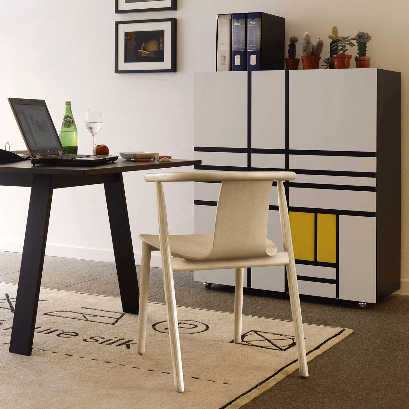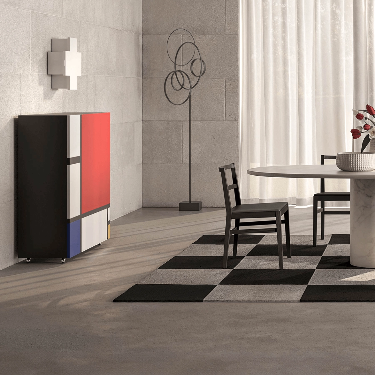 Homage To Mondrian est une collection de meubles de rangement inspirée de l’univers abstrait du peintre hollandais Piet Mondrian. Imaginés par le designer Shiro Kuramata et édités par Cappellini, ces bahuts design se distinguent par leurs façades rythmées de portes et de tiroirs laqués, reprenant les codes graphiques emblématiques du peintre. Montés sur roulettes en caoutchouc, ils allient mobilité et fonctionnalité tout en affirmant une forte présence visuelle. Véritables pièces de caractère, ils structurent l’espace et imposent leur identité dans un salon comme dans un bureau. À l’intérieur, niches et tiroirs permettent d’organiser et de dissimuler les objets du quotidien, laissant place à une composition esthétique proche de l’œuvre d’art. Les modèles sont disponibles en deux coloris : PC 18 (blanc/rouge/bleu/jaune) et PC 19 (blanc/jaune).