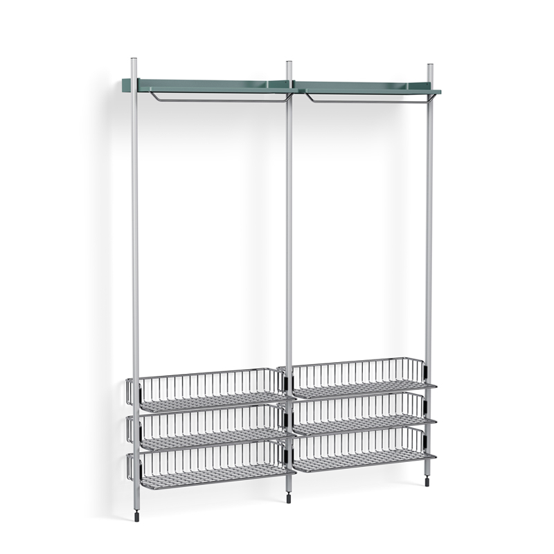 Dessiné par les célèbres designers Ronan & Erwan Bouroullec, Pier System est un système de rangement multifonctionnel, développé pour s’adapter aux conditions vie moderne. Livré à plat et facile à monter, à reconfigurer et à recycler, Pier System est doté d’une construction simple et flexible, qui permet de ranger et d’organiser de nombreux types d’objets. Réalisé à partir d’aluminium et d’acier en utilisant le minimum de composants nécessaires à un système de rangement complet, Pier System est disponible dans différentes couleurs et de nombreuses configurations, qui peuvent être combinées ensemble. Les éléments des configurations peuvent être déplacés selon les besoins ou les envies, pour intégrer les fonctions que l’on souhaite. Edité par Hay, le système de rangement Pier trouve sa place dans toutes les pièces de la maison, que ce soit le salon, la chambre, l’entrée ou le bureau. Il est également adapté aux espaces contract. La configuration 1022 est dotée de deux étagères avec penderies et de six étagère en fil d'acier.