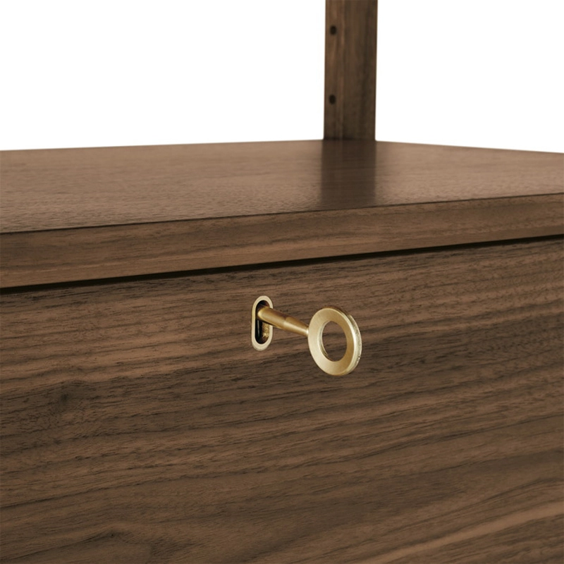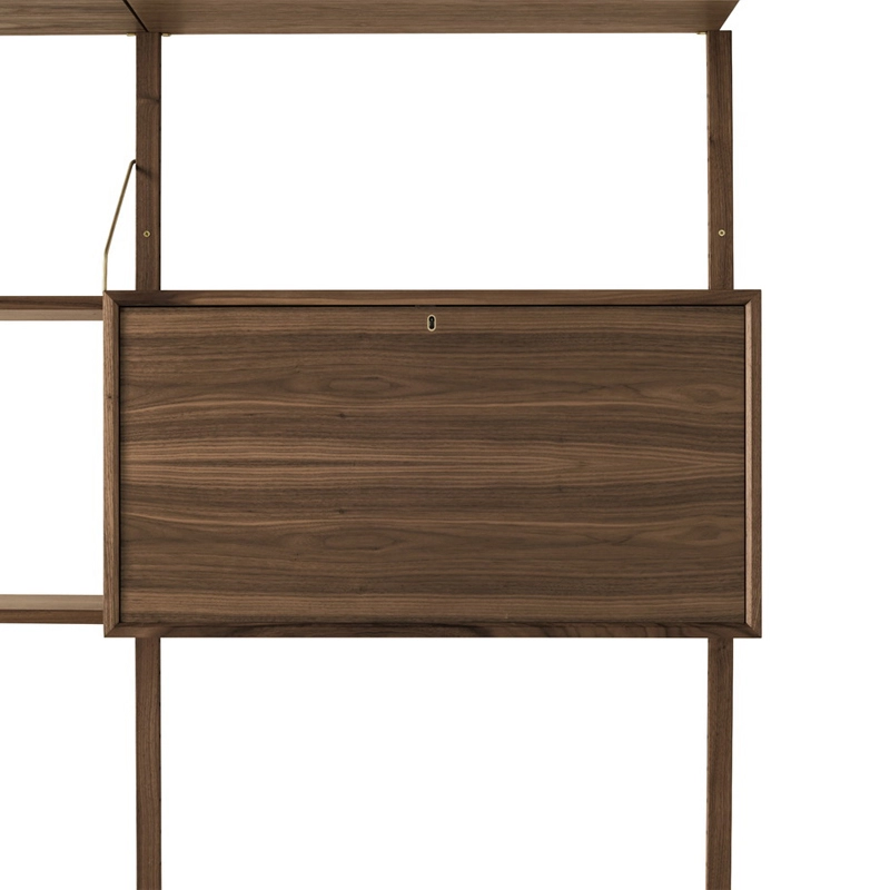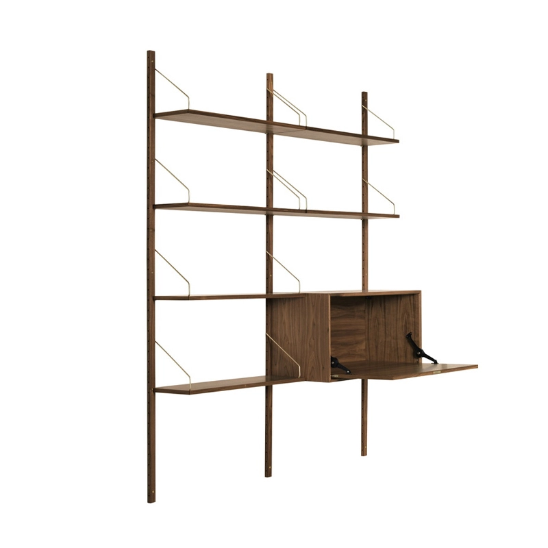 Royal System se compose de rails muraux en bois, d'étagères avec cintres en laiton ou en acier inoxydable et de diverses armoires. Le système peut être personnalisé dans de multiples combinaisons individuelles – soit comme système de bureau moderne, soit comme bibliothèque avec différentes armoires.