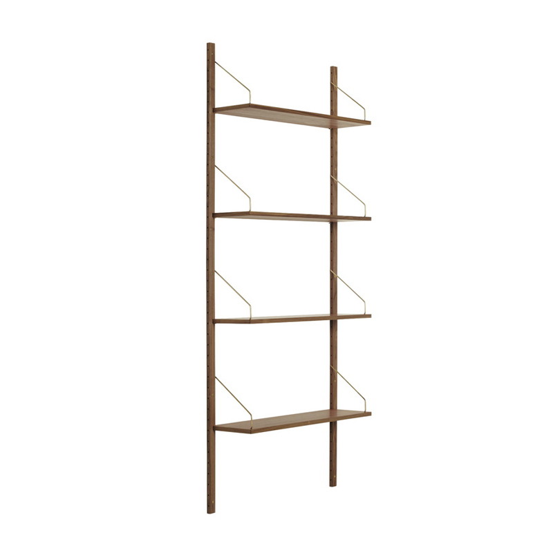 Royal System se compose de rails muraux en bois, d'étagères avec cintres en laiton ou en acier inoxydable et de diverses armoires. Le système peut être personnalisé dans de multiples combinaisons individuelles – soit comme système de bureau moderne, soit comme bibliothèque avec différentes armoires.