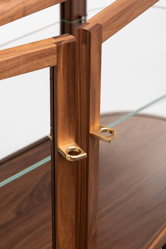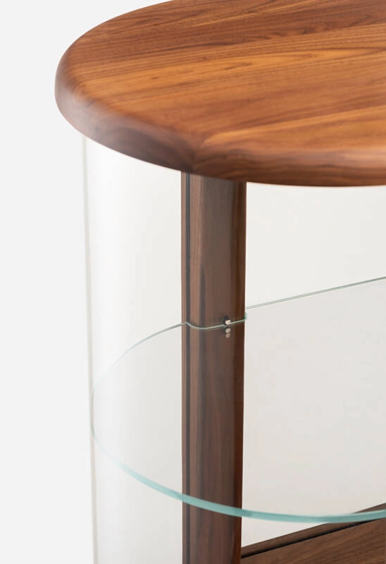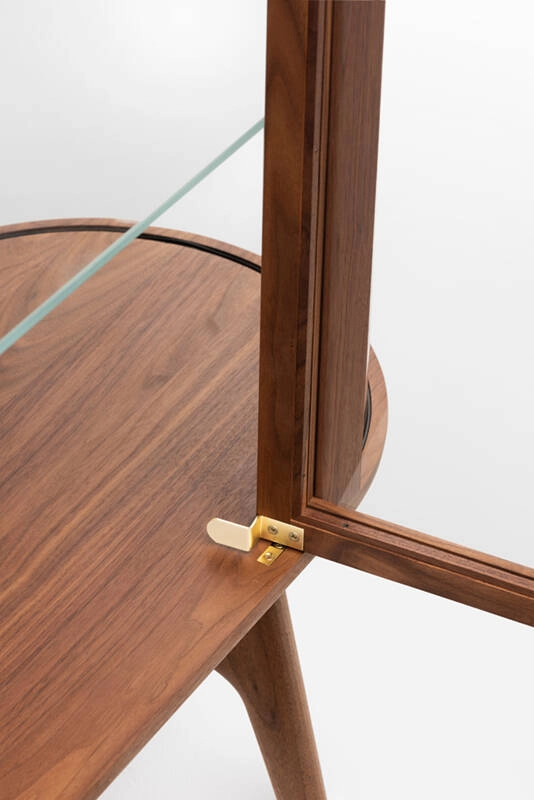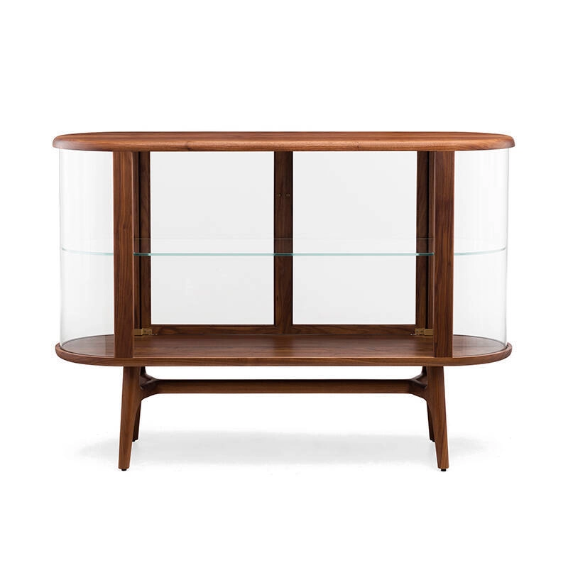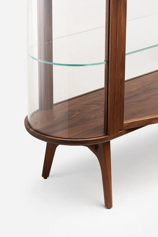 Solo Vitrine, qui fait partie de la série Solo, reflète la même esthétique moderne et chaleureuse, la même fonctionnalité réfléchie, les bords incurvés doux et les beaux détails du reste de la série. Cette vitrine en verre présente un verre incurvé et des extrémités arrondies qui peuvent s'intégrer harmonieusement avec d'autres meubles. De grandes surfaces de verre transparent comme étagères créent un affichage impressionnant où les objets à l'intérieur sont le principal point culminant visuel. Une armature en bois massif simple et élégante encadre la structure, avec des détails tels que des poignées en laiton usiné et un cadre de pied mince.
