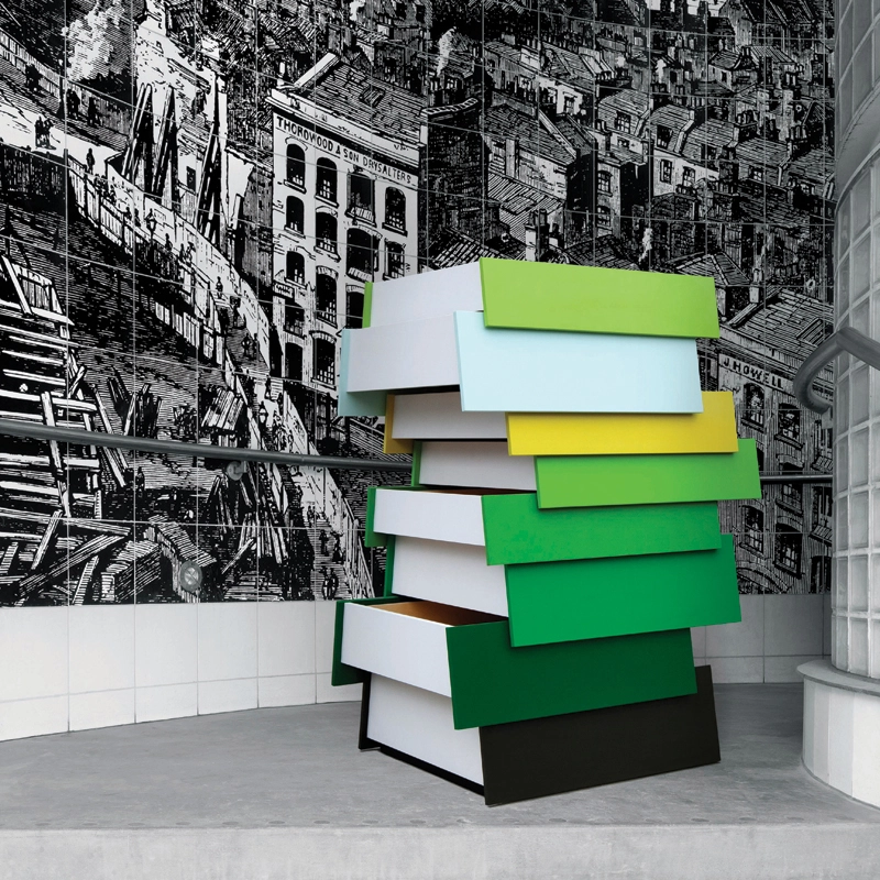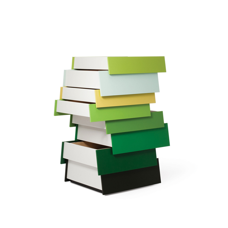 Stack est une collection de rangements conçue par Raw Edges et Shay Alkalay pour la marque Established and Sons. Défiant les codes d'une commode traditionnelle, Stack consiste en une association de tiroirs individuels qui semblent être juste empilés les uns au-dessus des autres. Les tiroirs de Stack s'ouvrent dans les deux sens, modifiant ainsi la silhouette du rangement et créant une composition irrégulière. Proposé par Established & Sons, Stack est à la fois une pièce sculpturale pouvant être appréciée de tous les point de vue et un rangement entièrement fonctionnel et très pratique. Il est disponible en version 8 ou 13 tiroirs et se décline dans de nombreuses palettes de couleurs joyeuses.