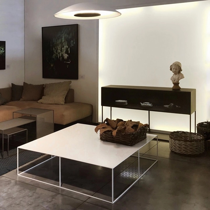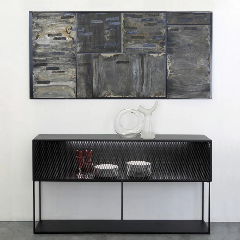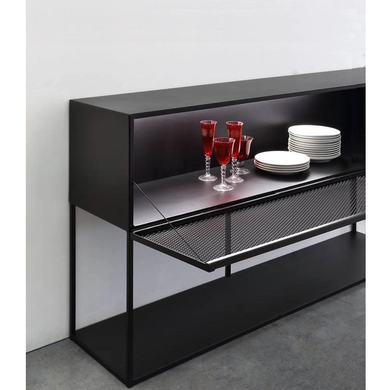 Réalisée en acier, la collection Tristano combine des surfaces pleines et des surfaces ajourées. La tôle pleine côtoie de la résille d’acier qui forme une texture aérienne et élégante, jouant avec la transparence. Avec sa forme simple et épurée, le buffet Tristano est une incarnation moderne de l’esthétique industrielle. Le buffet Tristano est muni d’un grand compartiment fermé par une porte en résille de métal (fermeture magnétique). Translucide, la résille de métal dissimule partiellement le contenu du buffet, ne permettant pas de distinguer nettement les contours des objets. En option, l'intérieur du buffet peut être équipé d'un éclairage LED. Tristano correspond complètement à la philosophie de la marque Zeus : créer des choses empreintes de simplicité et d'authenticité, à la fois fonctionnelles et économiques. Une quête de l'essentiel obtenue par une grande maîtrise des matériaux et un savoir-faire incomparable dans le travail du métal.