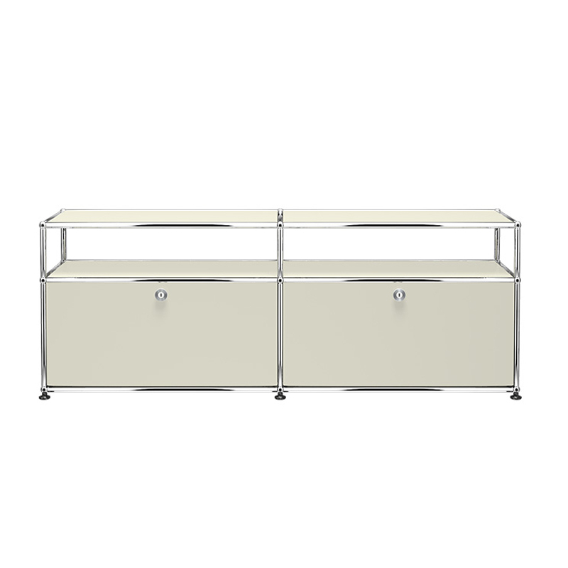 Le meuble Haller O2 est composé de deux portes abattantes et deux modules ouverts. Le meuble Haller O2 est doté d'une structure en acier chromé assemblé par des boules de connexion, habillée de panneaux d'acier thermolaqué et monté sur des patins réglables en hauteur.  Portes classiques ne nécessitant pas de clefs. (Sécurisées à la livraison, les portes se déverrouillent pour la première fois à l’aide d’une pièce ou d’une clef normale)