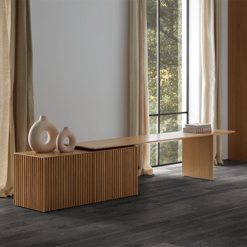 Créée par Ludovica et Roberto Palomba pour Punt Mobles, Velasca est à l’origine un projet architectural linéaire et minimaliste, mais chaleureux. Le buffet Velasca Extensible est un rangement linéaire, géométrique et rigoureux. Le bois est l’élément phare de sa conception, dans son essence mais aussi dans le détail des portes caractérisées par un motif vertical qui souligne sa tridimensionnalité. Velasca Extensible est un meuble polyvalent qui décore et résout les problèmes liés au manque de place, mais qui, grâce au bois et à ses déclinaisons, apporte chaleur et texture à l'espace. La mise en valeur du grain de l'essence de bois, liée à l'architecture de l'étagère, place le meuble dans une sorte d'équilibre délicat qui semble presque créer une sculpture suspendue dans le temps. Une fois de plus, les designers Ludovica et Roberto Palomba conçoivent un chef-d'œuvre minimaliste qui ne manque pas d'enthousiasmer Punt Mobles, qui s'est toujours distinguée par le soin et le raffinement des détails de ses projets. La collection Velasca est disponible dans les versions Velasca Extensible et Velasca Sideboard.