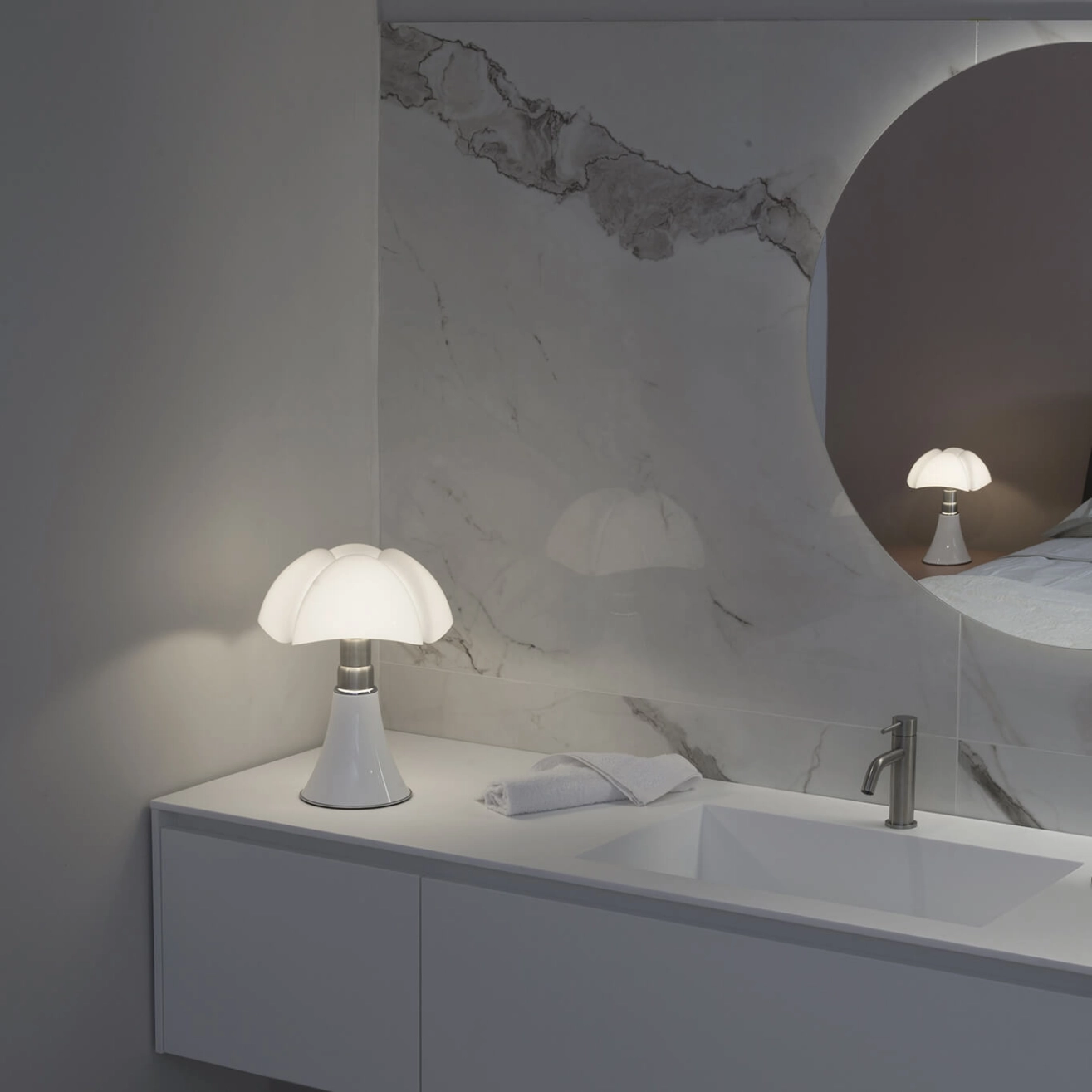 Son diffuseur en méthacrylate opalin blanc, façonné en quatre pétales délicatement courbés, diffuse une lumière douce, homogène et apaisante. Le traitement mat du socle renforce la dimension minimaliste et sophistiquée de ce modèle, en lui donnant une texture veloutée et contemporaine qui s’intègre naturellement dans tous les styles d’intérieur. Que ce soit sur une table de chevet, un bureau ou une console, la MiniPipistrello White Matt apporte une note lumineuse élégante et discrète.