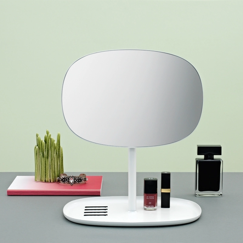 Flip est un miroir esthétique et fonctionnel, dessiné par le Studio Javier Moreno pour Normann Copenhagen. Ce miroir à pied de forme organique et sobre, est pourvu de plusieurs fonctions. Il peut être positionné vers le haut ou le bas, ou tout simplement tourné à 180°. Flip s'inspire des coiffeuses traditionnelles, qui présentent un miroir et accueillent divers petits objets qu'il est bon d'avoir sous la main avant de quitter la maison. Son pied fonctionne comme un plateau, idéal pour déposer ses bijoux ou son maquillage mais également ses clés ou autres accessoires dans l'entrée. Sa silhouette arrondie contraste avec les matériaux utilisés, le verre et l'acier, ce qui lui confère une apparence agréable et séduisante. Disponible en blanc, noir et sable, il s'adapte au style de votre intérieur, parfait sur une commode ou dans la chambre pour se maquiller.