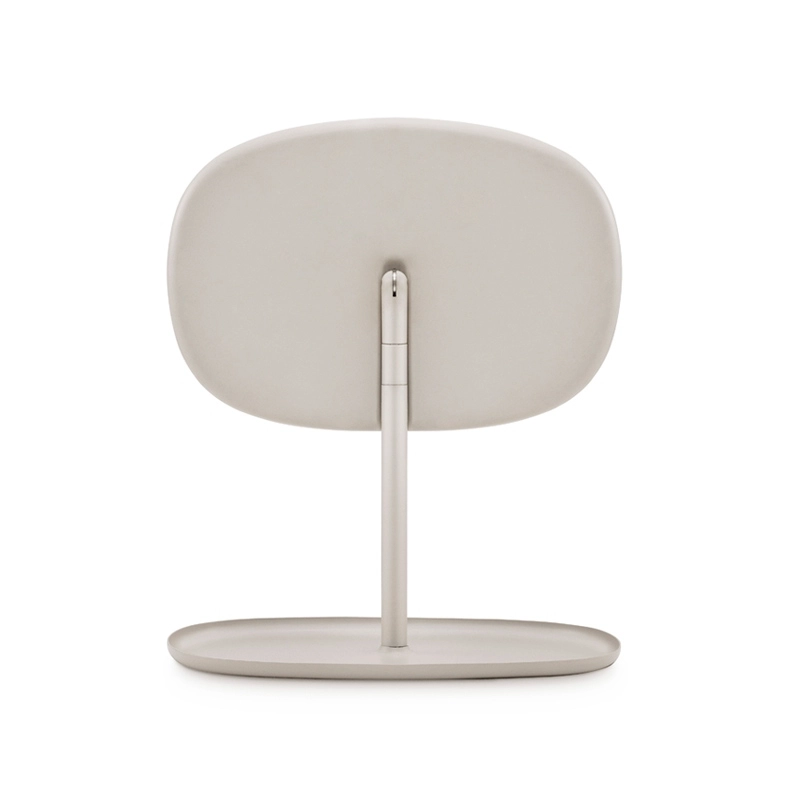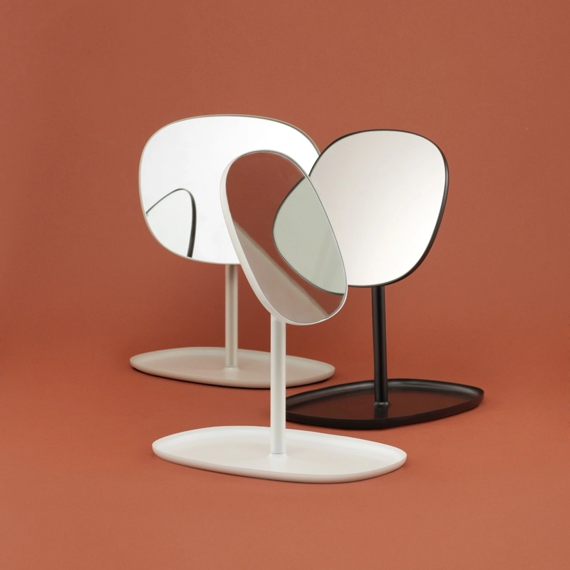 Flip est un miroir esthétique et fonctionnel, dessiné par le Studio Javier Moreno pour Normann Copenhagen. Ce miroir à pied de forme organique et sobre, est pourvu de plusieurs fonctions. Il peut être positionné vers le haut ou le bas, ou tout simplement tourné à 180°. Flip s'inspire des coiffeuses traditionnelles, qui présentent un miroir et accueillent divers petits objets qu'il est bon d'avoir sous la main avant de quitter la maison. Son pied fonctionne comme un plateau, idéal pour déposer ses bijoux ou son maquillage mais également ses clés ou autres accessoires dans l'entrée. Sa silhouette arrondie contraste avec les matériaux utilisés, le verre et l'acier, ce qui lui confère une apparence agréable et séduisante. Disponible en blanc, noir et sable, il s'adapte au style de votre intérieur, parfait sur une commode ou dans la chambre pour se maquiller.
