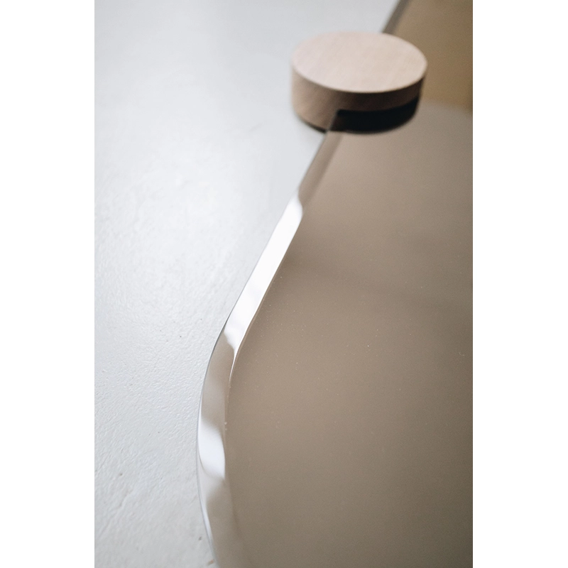 Imaginé par Adrian Blanc pour Harto, le miroir Sonia se distingue par ses formes graphiques et rondes qui apportent douceur et élégance. Fabriqué au Portugal, il est réalisé en verre légèrement fumé, relevé d’une pointe de chêne massif. Avec son arche majestueuse, c'est un miroir architectural, combiné à un jeu d’optique, où la pièce de bois, comme un point de ponctuation, se reflète en cercles concentriques. Le miroir Sonia Harto s’accroche au mur grâce à un tasseau, et peut se positionner à l’horizontale ou à la verticale sans modifier l’orientation du tasseau.