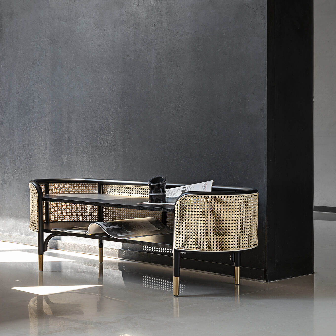 Hêtre cintré laqué, inserts en paille de Vienne, plateaux plaqué frêne teinté à pores ouverts, pieds en laiton