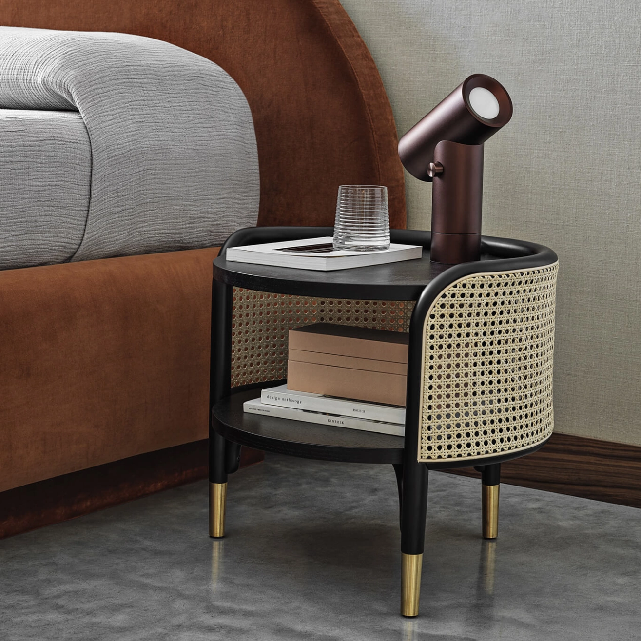 Structure hêtre cintré et inserts en paille de Vienne, plateaux en plaqué frêne teinté à pores ouverts, pieds laiton