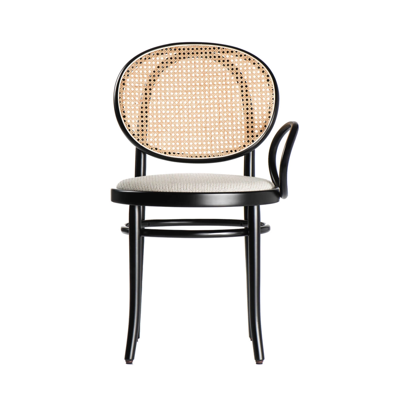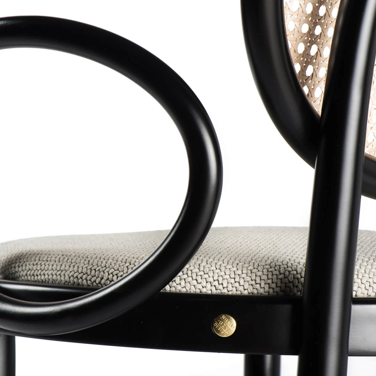 Hêtre cintré laqué, assise rembourrée, revêtement tissu Coda, dossier en paille de Vienne