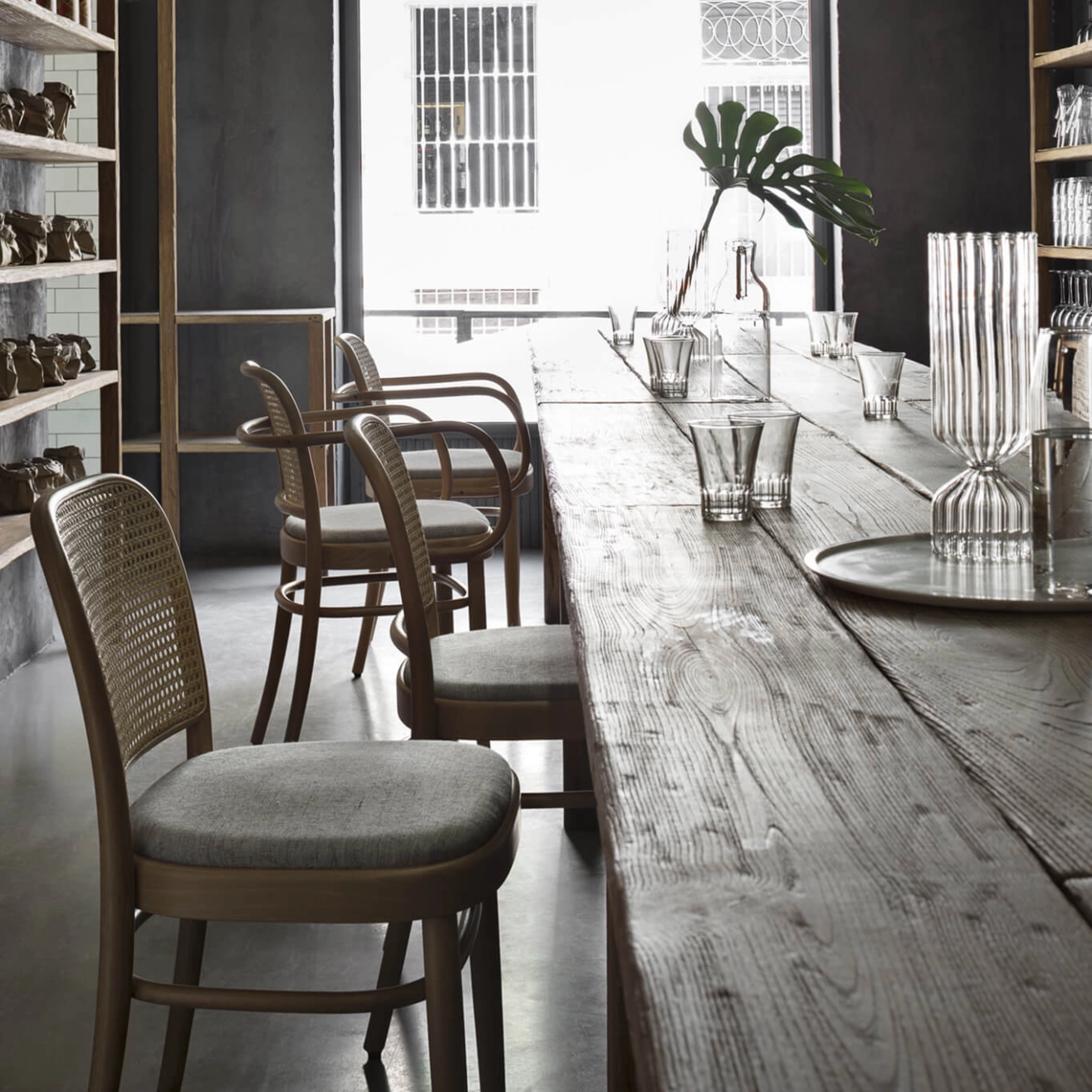 La chaise N.811 est une pièce intemporelle qui allie légèreté visuelle, confort et savoir-faire artisanal. Conçue à l’origine dans les années 1930 par Josef Hoffmann, figure emblématique du modernisme viennois, elle incarne parfaitement l’héritage de GTV (Gebrüder Thonet Vienna) dans l’art du bois courbé. Sa structure en bois de hêtre cintré à la vapeur met en valeur des lignes sobres et fonctionnelles, tout en conservant une certaine chaleur artisanale. L’assise disponible en version rembourrée assure un bon confort d’usage, tandis que le dossier légèrement incurvé, offre un bon soutien du dos. Polyvalente, la chaise N.811 s’adapte aussi bien aux espaces résidentiels qu’aux environnements professionnels : salle à manger, restaurant, bistrot ou salle de réunion. Elle est disponible dans une large palette de finitions bois et tissus.