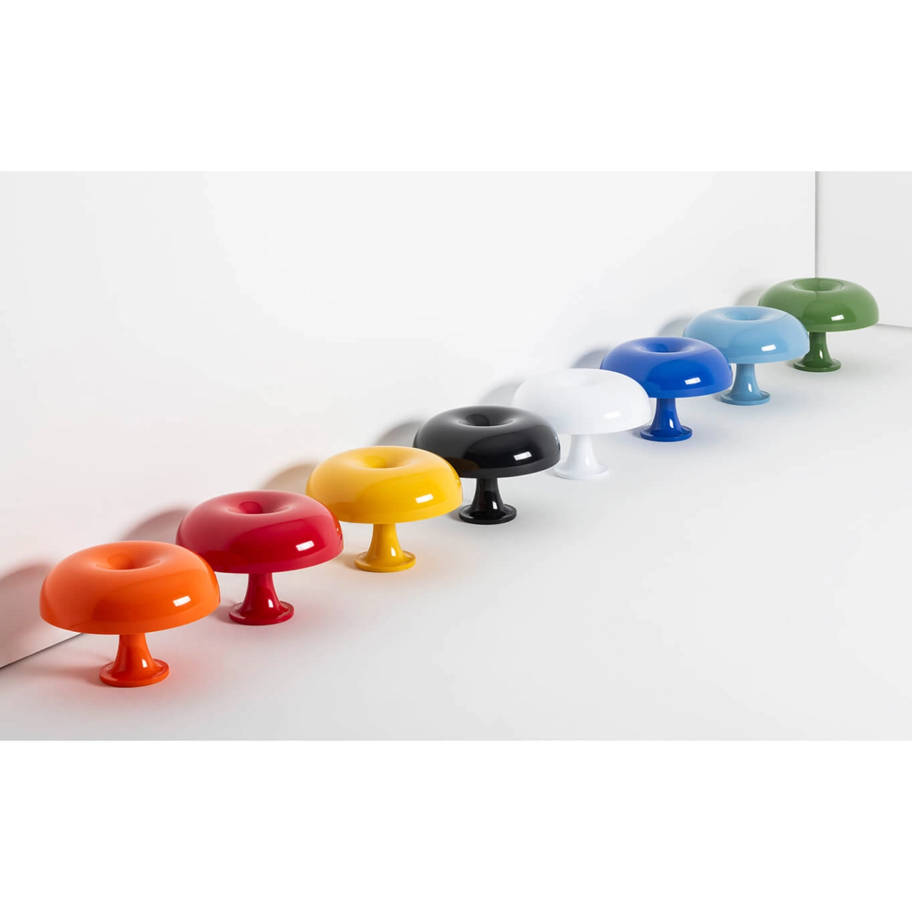 Nessino, dessinée par Giancarlo Mattioli, est l'édition actualisée et revisitée de la célèbre lampe de table Nesso, éditée par Artemide, qui avait remporté le 1er prix du Concours Studio Artemide/Domus à Milan en 1965 et reconnaissable par sa forme de champignon et ses couleurs très années 70. Le corps et le diffuseur sont en polycarbonate. Sa lumière est diffuse et colorée. Nessino est disponible en orange, orange transparent ou blanc apporter une touche de gaieté dans votre chambre ou dans le salon.