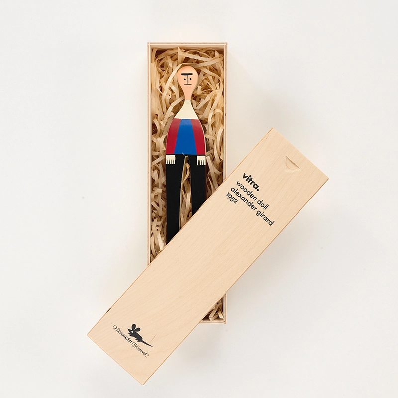 Inspiré par sa vaste collection d'œuvres d'art populaire, l'architecte et designer Alexander Girard crée les Wooden Dolls pour sa propre maison à Santa Fe, destinées uniquement à son usage personnel. Entre l'objet de décoration et le jouet, les Wooden Dolls sont désormais disponibles au grand public, pour enrichir votre aménagement intérieur. Les Wooden Dolls font partie de la collection du Vitra Design Museum, reconnues internationalement, et exposées dans de nombreux musées et galeries de design. Incontournables, ces petites poupées fabriquées et peintes à la main en bois de pin massif, sont vendues dans leur écrin en bois imprimé. Les Wooden Dolls vous charmeront sans aucun doute, que vous en ayez une ou plusieurs, car ces objets insolites sont, selon le designer : « un microcosme du monde humain et des rêves , elles représentent la fantaisie, l'imagination, l'humour et l'amour ».