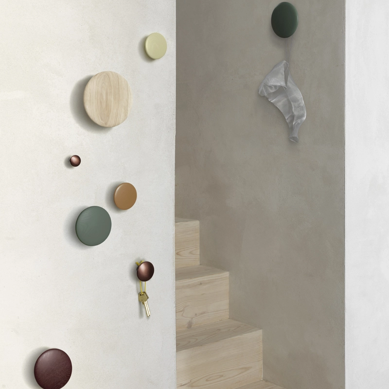Créées par Lars Tornøe et éditées par Muuto, les patères Dots prennent très peu de place et permettent de créer une composition très personnelle. Muuto a une inspiration tous azimuts, aussi bien pour les étagères que les luminaires et pour chacun des produits présentés, la volonté de faire utile, de faire simple représente la marque. Dots Muuto sont cinq patères aux lignes arrondies et douces. De trois tailles différentes, vous pouvez placer les cinq patères seules ou à plusieurs, à différentes hauteurs, sur le mur d'une chambre, de la salle de bain ou de l'entrée pour créer un portemanteau personnalisé. En effet, avec leur matière naturelle, ces pateres design s’intègrent dans n’importe quel intérieur. The dots Muuto allient ainsi, design et praticité. Très déco, les Pateres dots Muuto sont réalisées en chêne naturel pour un effet bois très zen, polis en forme de cercle. Disponibles en plusieurs finitions, les patères Dots sont un pur bonheur de simplicité et de douceur.