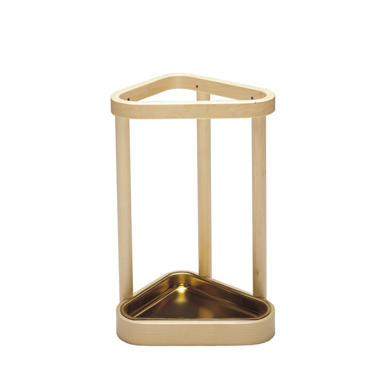 Le porte-parapluie triangulaire Umbrella Stand, dessiné par l'architecte et designer finlandais Alvar Aalto en 1936, est réalisé en bois de bouleau. Artek édite ce porte-parapluie qui possède un plateau en cuivre à la base récolte efficacement l'eau des parapluies. Les matériaux et la structure font de Umbrella Stand  une pièce qui se démarque avec élégance dans l'entrée de la maison. Sa forme compacte permet de le positionner contre un mur mais surtout dans l'angle d'une pièce.