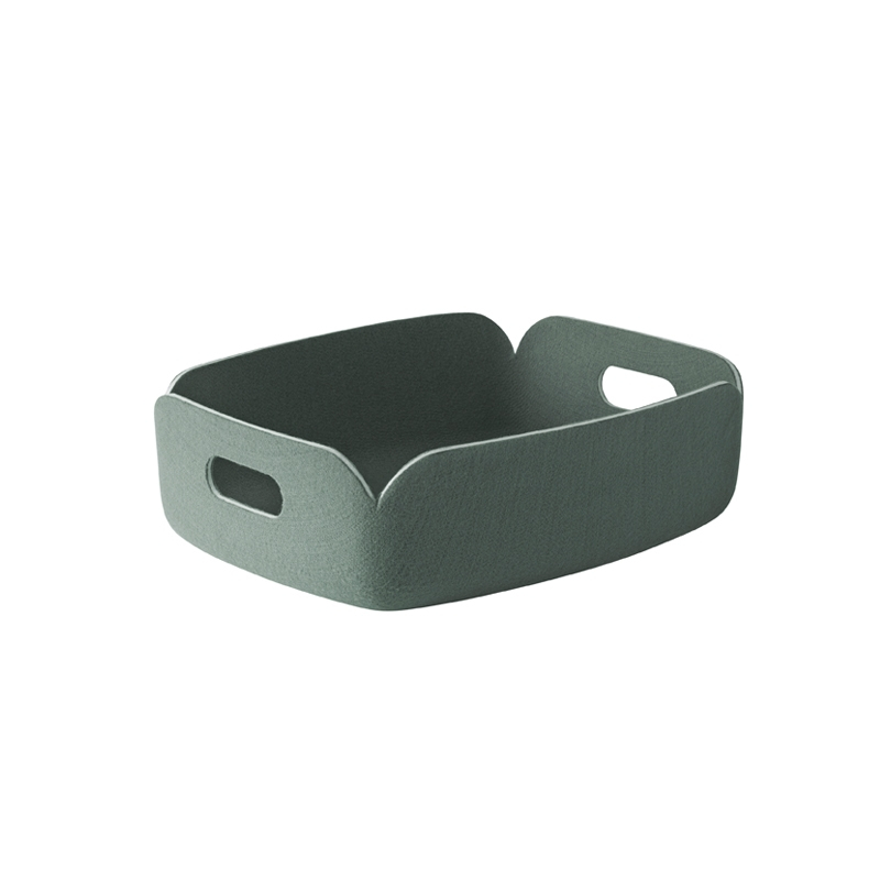 La série Restore de Mika Tolvanen de Muuto s'agrandit avec le Restore Tray, un panier aux dimensions réduites qui peut servir à la fois de rangement et de plateau. 100% écologique, il est réalisé en feutre produit à partir de bouteilles en plastique. La finition de Restore confère un certain raffinement à l'objet qui s'intègre aussi bien dans un salon pour les magazines ou les objets qui trainent, que dans un bureau pour ranger des papiers.