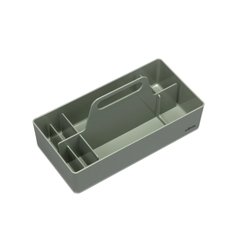 Toolbox est un organisateur conçu par Arik Levy pour la marque Vitra. Toolbox est pratique au quotidien pour le rangement et le transport de petits ustensiles et accessoires de travail. L'organisateur Toolbox RE est fabriqué en plastique recyclé. Le matériau de recyclage de haute qualité provient de déchets ménagers recyclés, en particulier par des emballages usagés. De plus en fin de vie l'organisateur est également 100% recyclable. La couleur de Toolbox présente de très légères irrégularités de couleur puisque la teinte gris foncé est la teinte naturelle du matériau de recyclage traité.