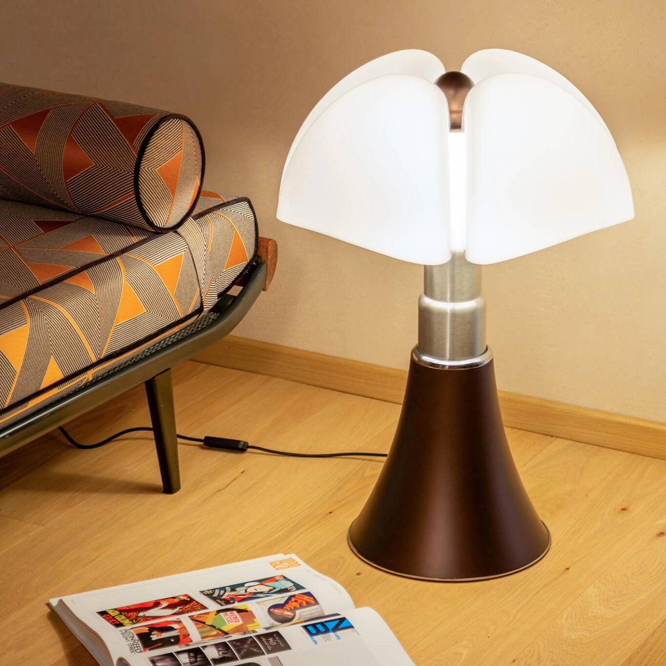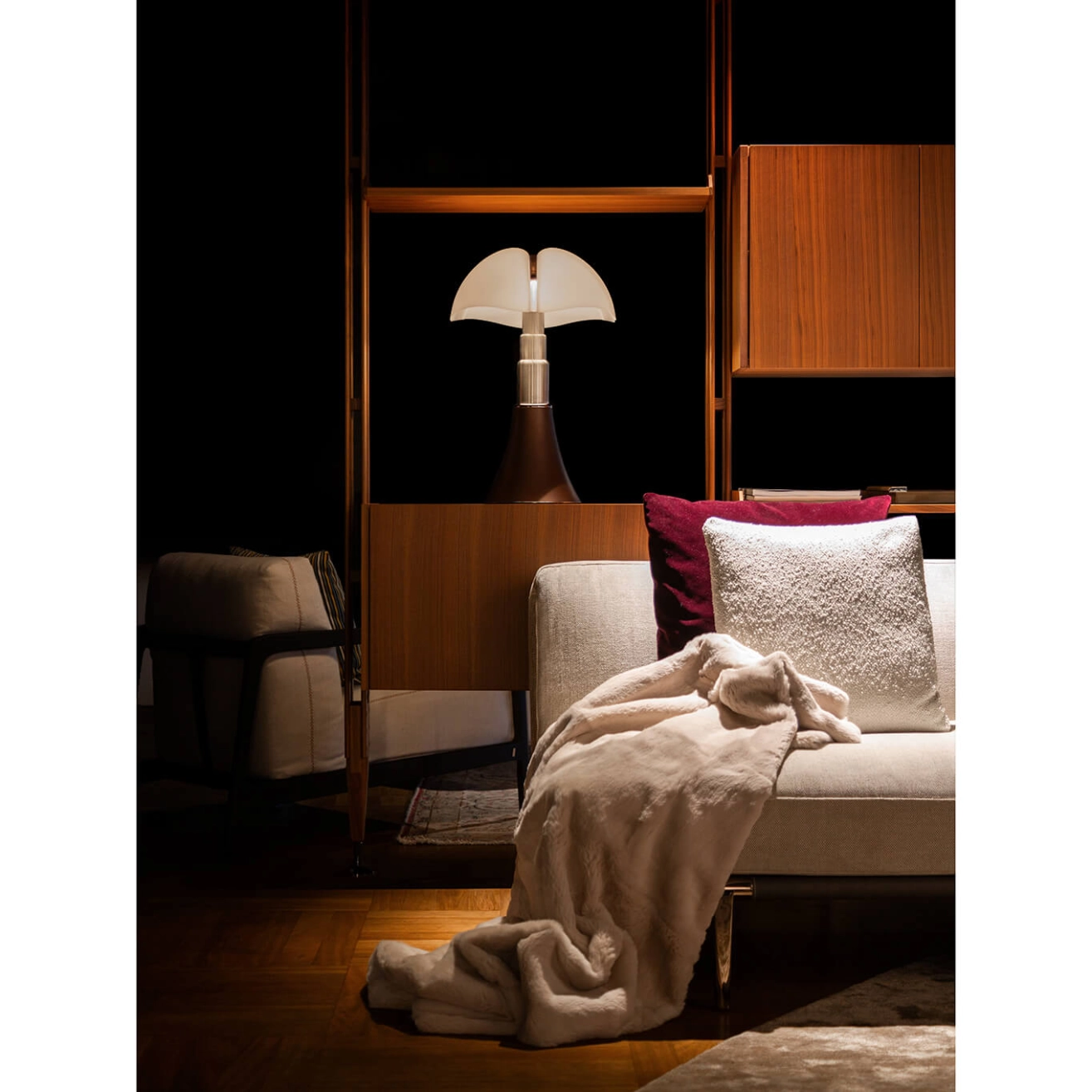 Dotée d’un mât télescopique en acier inoxydable, la Pipistrello permet d’ajuster sa hauteur avec élégance, passant aisément d’une lampe de table à une lampe d’appoint selon les besoins. Son diffuseur en méthacrylate opalin blanc, moulé en quatre pétales, diffuse une lumière douce et enveloppante. Cette luminosité, à la fois chaleureuse et équilibrée, crée une atmosphère apaisante dans tous types d’espaces, du salon au bureau en passant par la chambre.