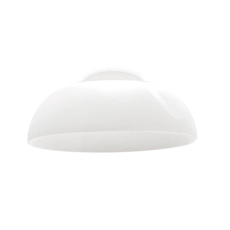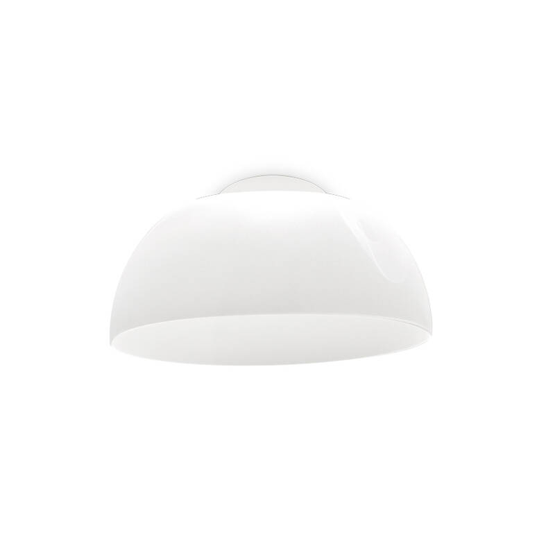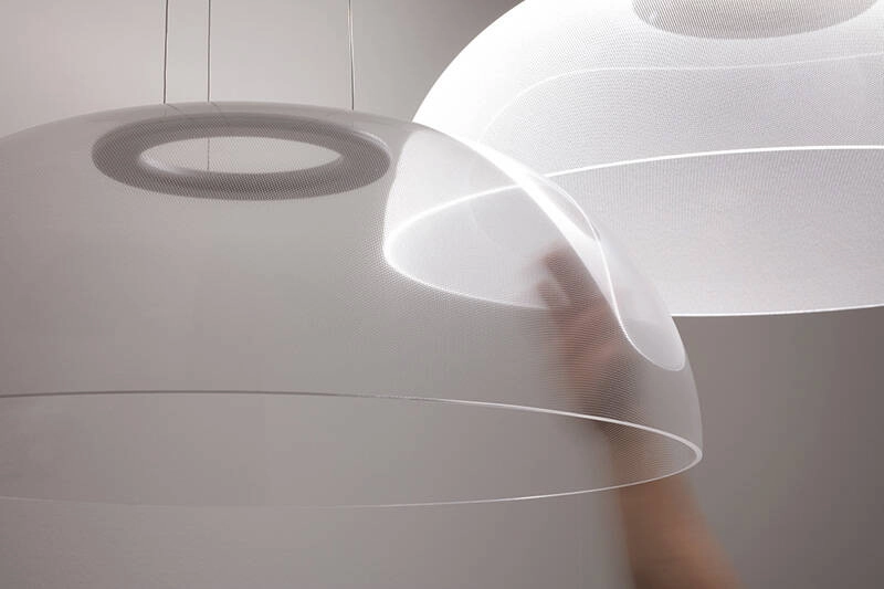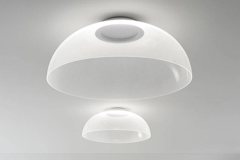 Lorsqu'il est éteint, le plafonnier Demì, est une grande coupole transparente. Lorsque Demì est allumé, grâce à la technologie exclusive OptiLight™, le bord inférieur et les milliers de micro incisions au laser de la surface diffusent une lumière douce et homogène. Celle-ci est générée par une source LED invisible située dans l'anneau du grand trou supérieur qui, comme dans l'ancien Panthéon, est la source de lumière. Le plafonnier Demì a été créé en 2019 par le designer Mirco Crosatto pour Stilnovo.