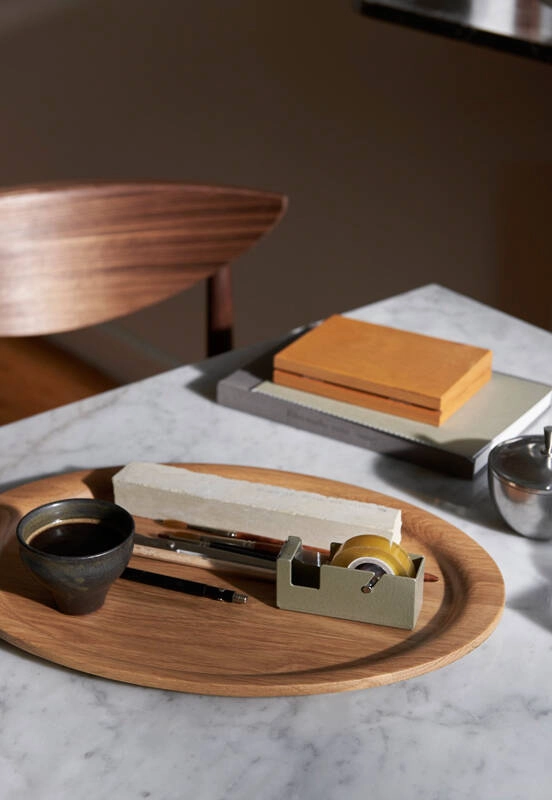 Taillé dans du bois massif, ce plateau légèrement incurvé présente une forme fluide et des veines naturelles qui traversent le bois. Il fait partie de Collect, une collection de tissus d'ameublement et d'objets de maison magnifiquement conçus par Space Copenhagen pour And Tradition et se décline disponible en deux finitions : chêne laqué et noyer laqué.