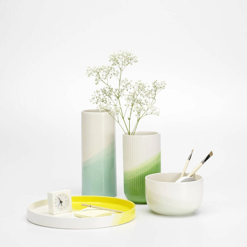 Créée par Raw-Edges pour l'ameublement et l'agencement d'un étage entier de la VitraHaus sur le Vitra Campus, la collection Herringbone est née de l‘intérêt du studio pour la technique de la teinture par immersion. Les Herringbone Vessels sont créés en plongeant à plusieurs reprises des bols et des vases en céramique dans une glaçure colorée. Ce processus réalise un motif obéissant à une logique intrinsèque, déterminée par l‘angle d‘immersion ainsi que par la forme et le poids de l‘objet. La transformation de différents matériaux et formes par trempage dans un bain de teinture exerce une fascination presque magique sur le duo de designers Shay Alkalay et Yael Mer, ce qui a conduit à la décision d‘affiner encore la conception de la collection Herringbone pour la production en série chez Vitra. Entièrement réalisé à la main, chaque bol, vase et plateau de la collection Herringbone Vessels est un objet unique.