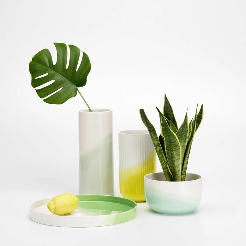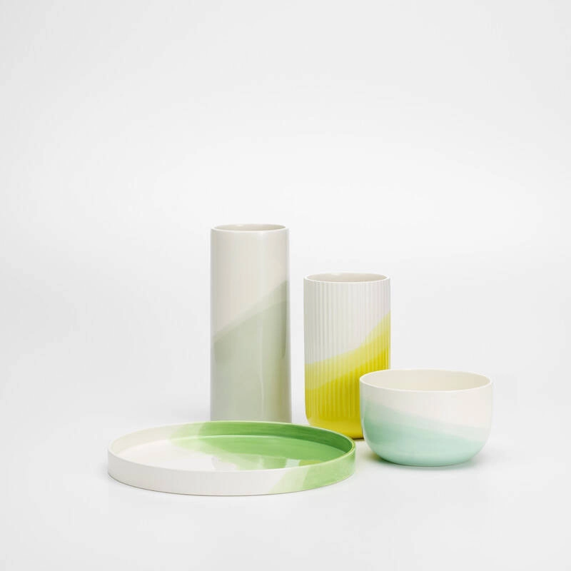 Créée par Raw-Edges pour l'ameublement et l'agencement d'un étage entier de la VitraHaus sur le Vitra Campus, la collection Herringbone est née de l‘intérêt du studio pour la technique de la teinture par immersion. Les Herringbone Vessels sont créés en plongeant à plusieurs reprises des bols et des vases en céramique dans une glaçure colorée. Ce processus réalise un motif obéissant à une logique intrinsèque, déterminée par l‘angle d‘immersion ainsi que par la forme et le poids de l‘objet. La transformation de différents matériaux et formes par trempage dans un bain de teinture exerce une fascination presque magique sur le duo de designers Shay Alkalay et Yael Mer, ce qui a conduit à la décision d‘affiner encore la conception de la collection Herringbone pour la production en série chez Vitra. Entièrement réalisé à la main, chaque bol, vase et plateau de la collection Herringbone Vessels est un objet unique.