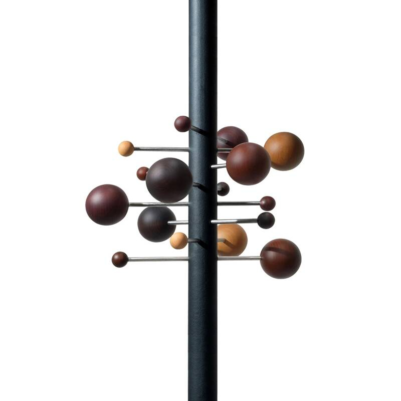 AT16 est un porte-manteau pivotant à hauteur réglable, dessiné par Osvaldo Borsani en 1961 et rééditée en 2012 par Tecno. Le mât central de l’AT 16 a une structure composée d’un tube externe et deux tubes concentriques coulissants en aluminium anodisé noir dont le blocage est garanti par des rondelles en aluminium poli. Le passage des tubes coulissants porte-boules en acier inox brossé se fait à travers le mât central. Les boules sont réalisées en bois massif de hêtre, teinté en quatre coloris différents ; le diamètre est de 9 cm pour les grandes boules et de 3,5 cm pour les petites. La hauteur du porte manteau est réglable de 270 à 320 cm, pour un encombrement horizontal de 69 cm maximum. L'installation en appui avec disque antidérapant au sol se fait grâce à une tige encastrée au plafond (Ø 1,2cm). Edité par