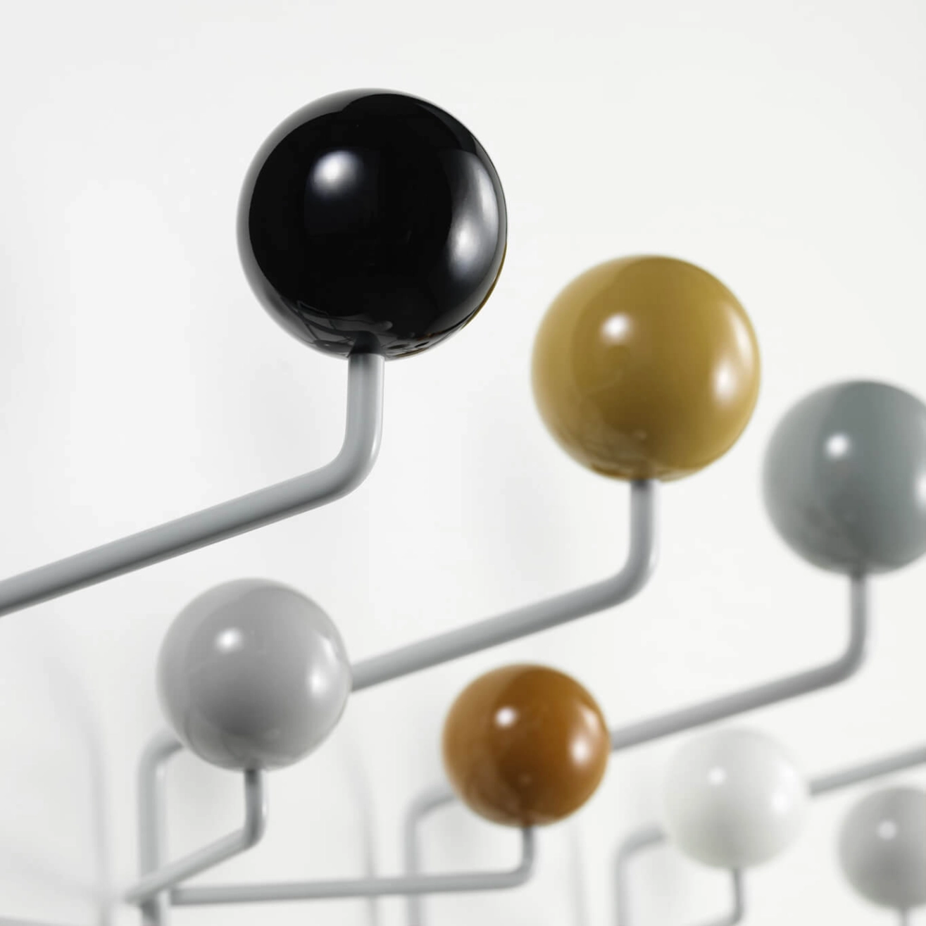 Le duo Charles et Ray Eames crée en 1953 un portemanteau fantaisiste pour Vitra. Telle une sculpture insolite et pleine de gaieté, Hang it all est un portemanteau qui permet, grâce à ses boules en bois aux couleurs vives, de suspendre chapeaux, écharpes, vestes et manteaux. Il remplace les banales patères et incite les enfants à y suspendre « toutes leurs affaires », comme son nom l'indique, aussi bien leurs poupées que leurs patins à roulettes ! Le portemanteau Hang it all peut être étendu à l'infini et constitue une alternative ludique aux crochets monotones, aussi bien dans la chambre des enfants que dans l'entrée de la maison. Hang it all est un accessoire de la vie quotidienne plein de fantaisie, exposé au Vitra Design Museum. Plus qu'un must-have aujourd'hui, il égaye votre intérieur de façon originale, et constitue une idée de cadeau qui allie l'utile à l'agréable.