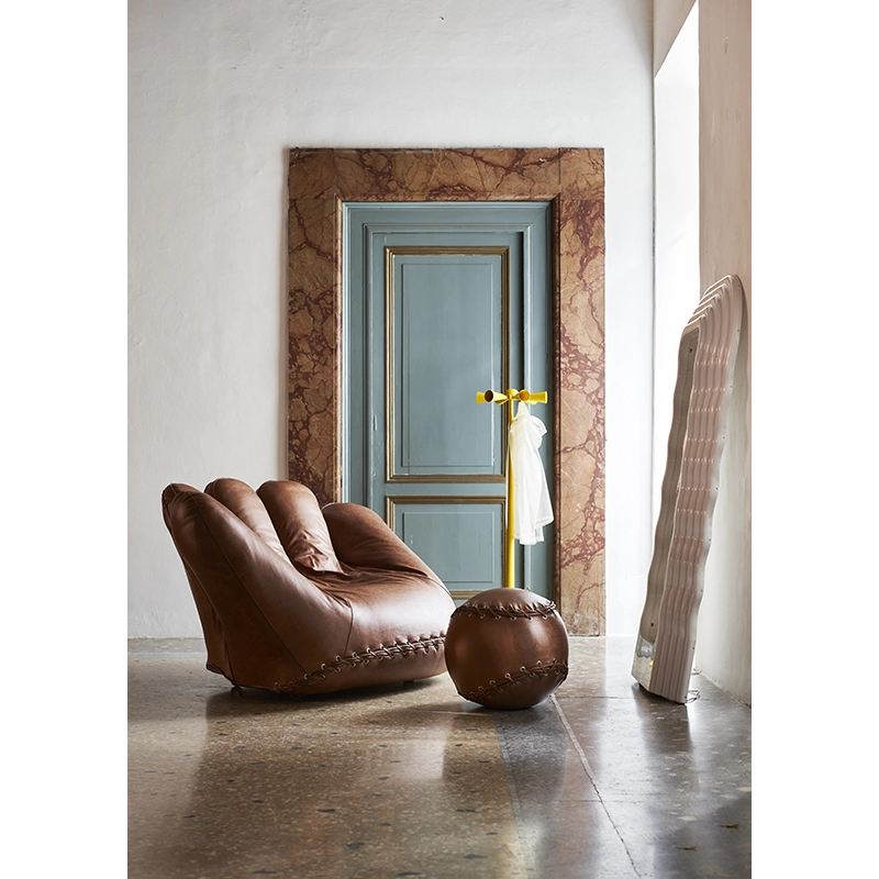 Le repose-pied en cuir Joe Ball a été créé à l'occasion du cinquantième anniversaire du célèbre fauteuil Joe, dessiné par le Studio De Pas, D'Urbino et Lomazzi et édité par Poltronova. La forme et les coutures typiques de Joe Ball rappellent celles d'une balle de baseball. Le pouf Joe Ball complète naturellement le fauteuil Joe.Il est doté d’un poids à l'intérieur qui le rend stable comme un siège. Le cuir utilisé pour créer le pouf repose pied Joe Ball porte les marques caractéristiques du Centro Studi Poltronova.